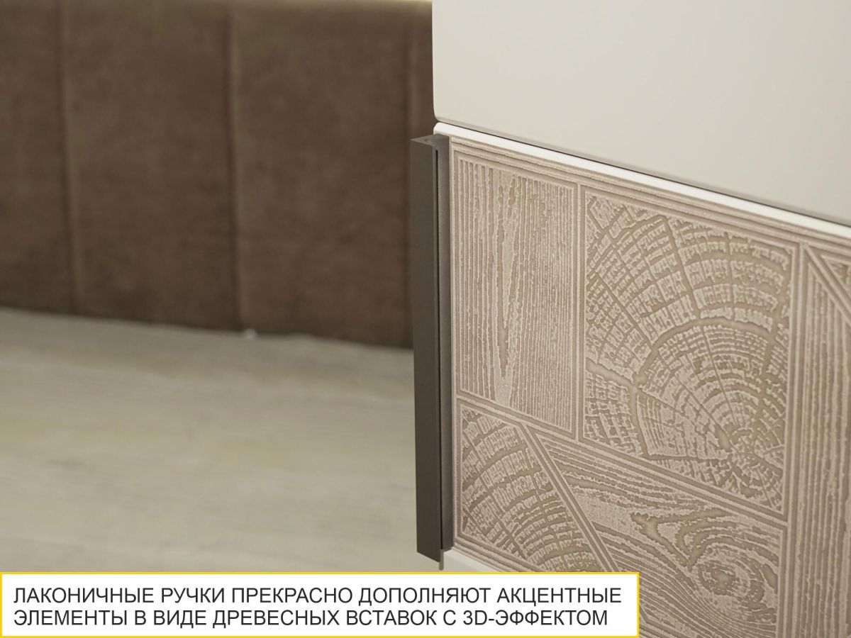 - Дверца шкафа декорирована фактурной патинированной вставкой с имитацией спила натурального дерева. Декор не стирается и не тускнеет со временем.