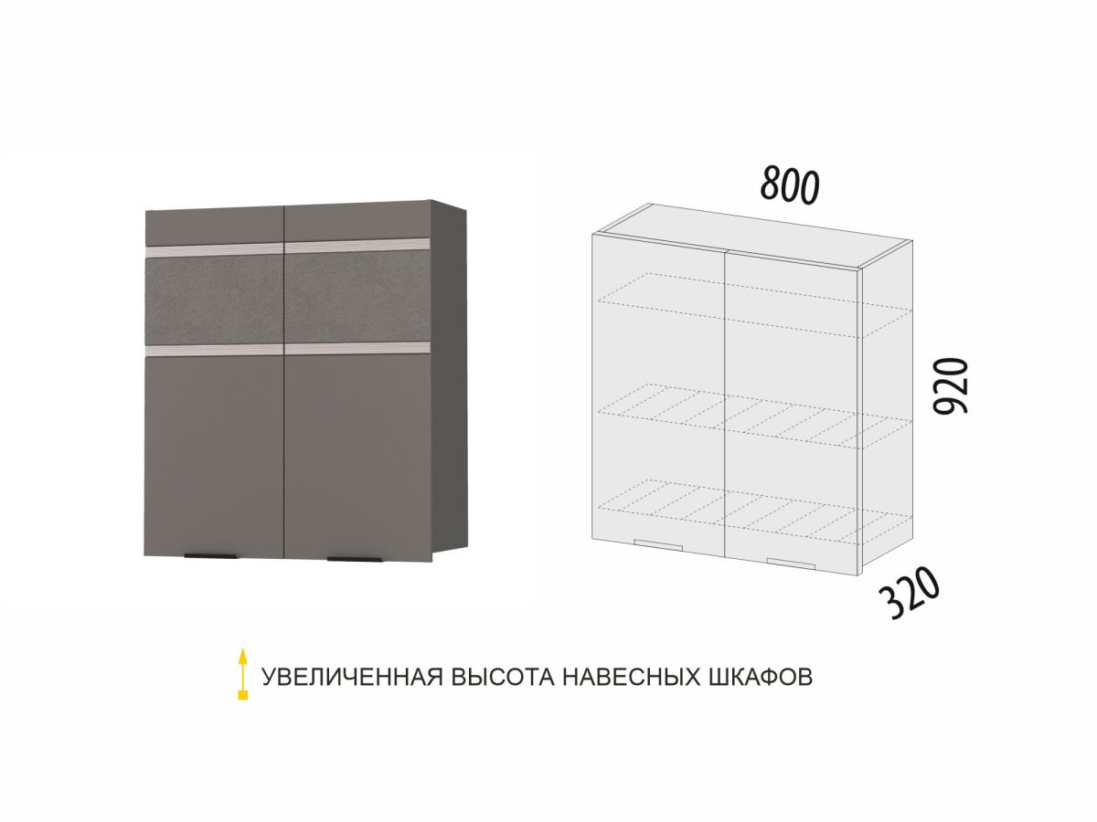 - Увеличенная высота навесных шкафов позволяет эффективно использовать пространство кухни.