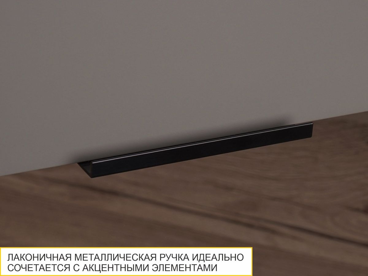 - Отсутствие лицевой фурнитуры подчеркивает современный дизайн мебели, дверцы модулей легко и удобно открываются за счет свеса фасада. По желанию можно установить ручки, прекрасно гармонирующие с акцентными элементами. Ручки входят в комплект.