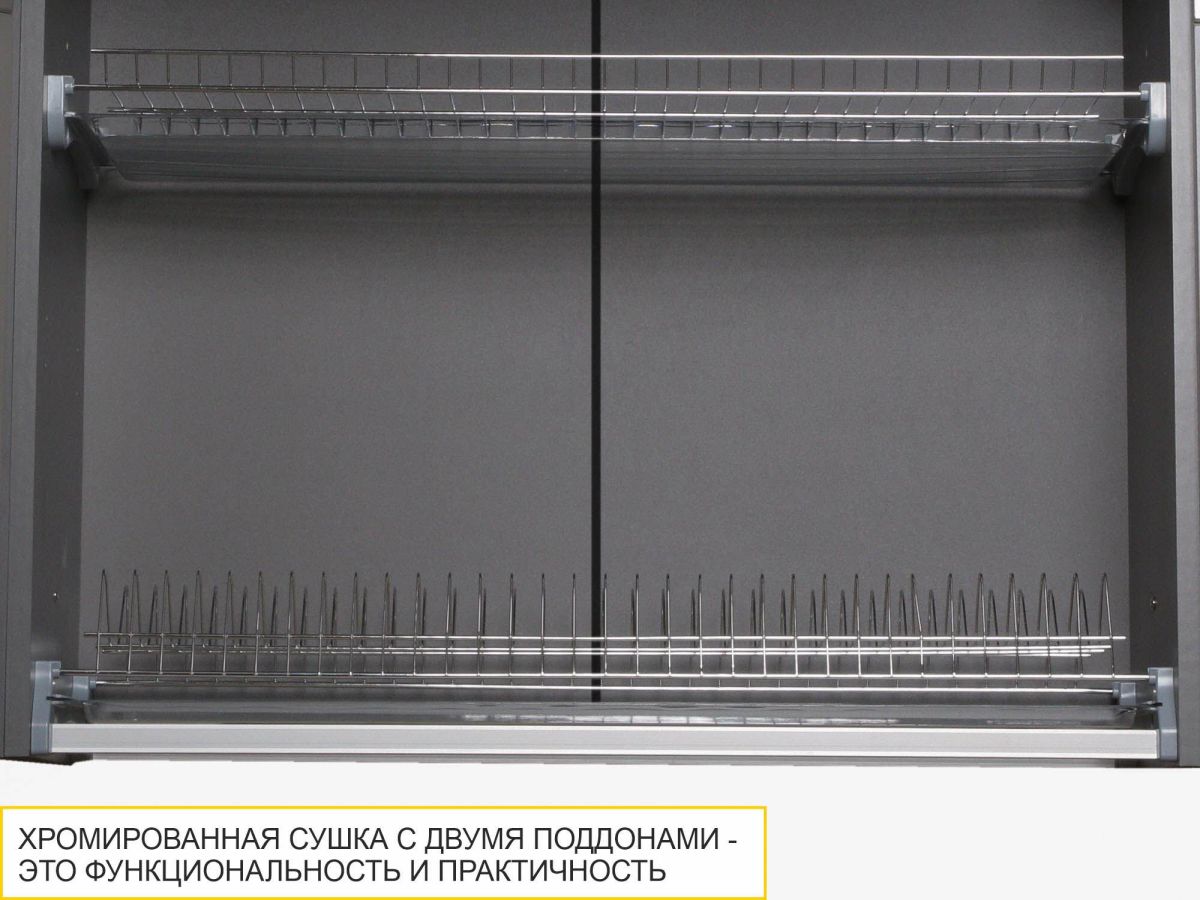 - Шкаф-сушка комплектуется одной полкой из ЛДСП и двумя сетками: для тарелок и плоской для стаканов.