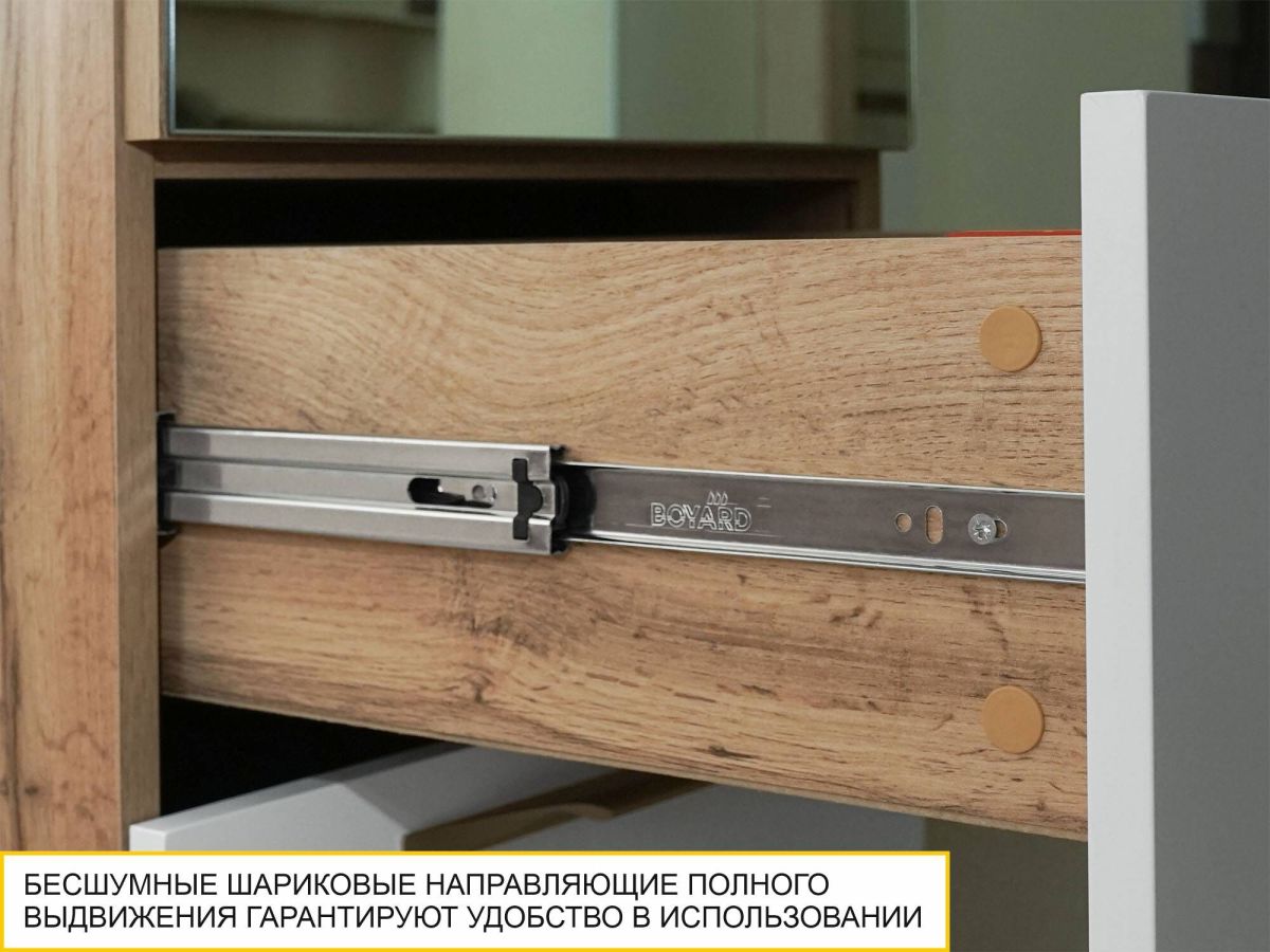 • В нижней части модуля с зеркалом установлены полновыкатные ящики. Шариковые направляющие обеспечивают бесшумный ход и длительный срок эксплуатации изделия.