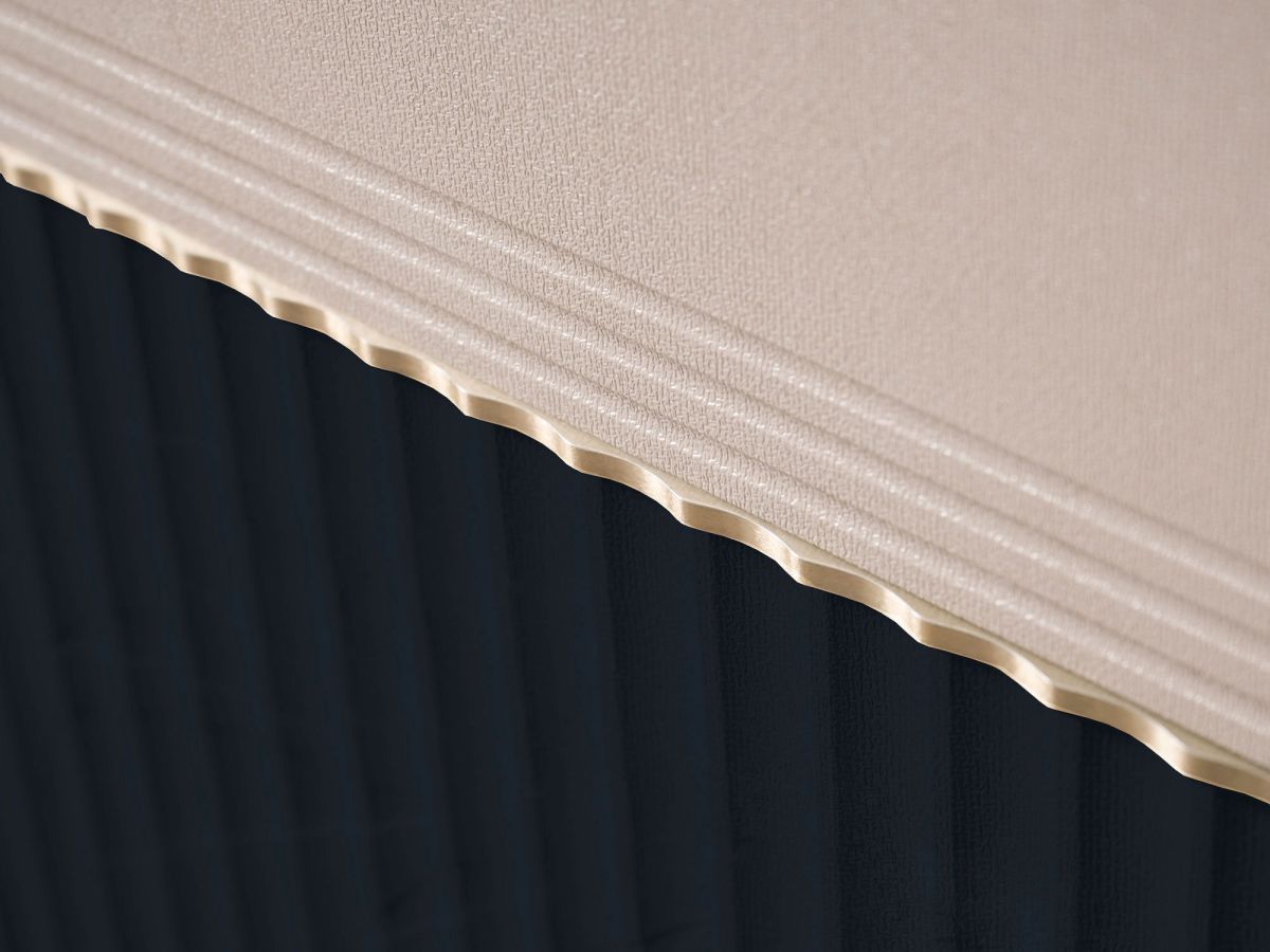 • Металлическая пластина на фасаде толщиной 5 мм проходит обработку по собственной технологии покрытия, которая придает ей изысканный оттенок «сатинового золота». Она гармонично сочетается с цветом фурнитуры и повторяет геометрию вертикальных реек.