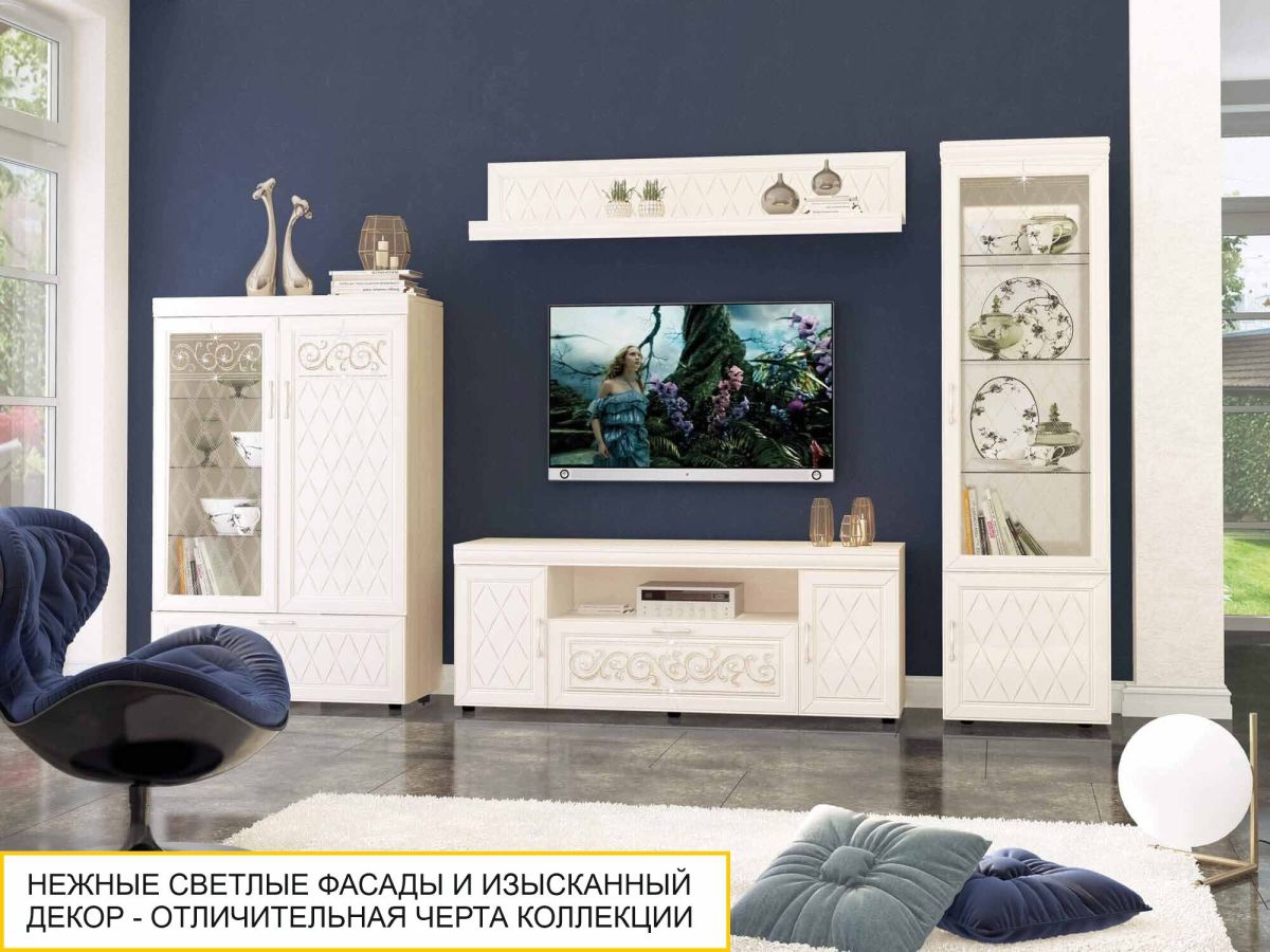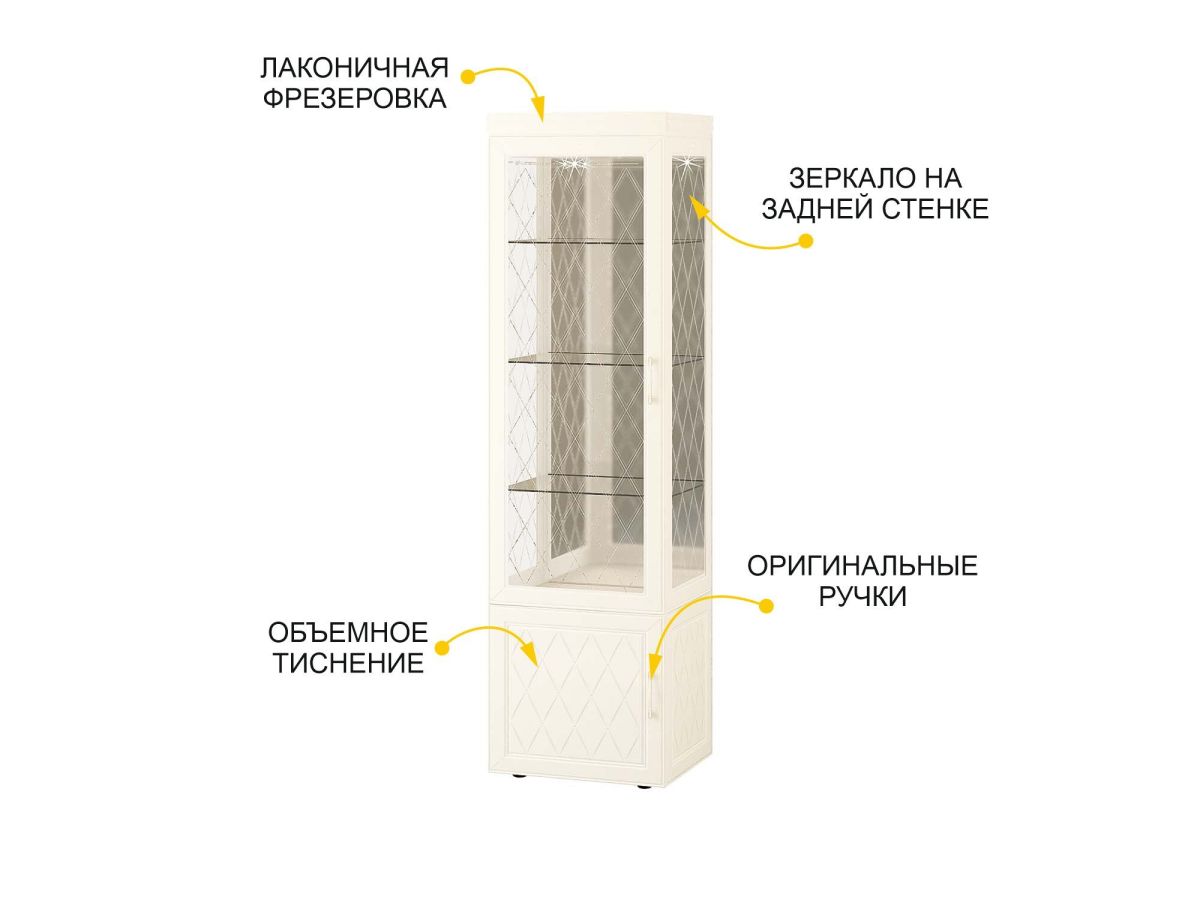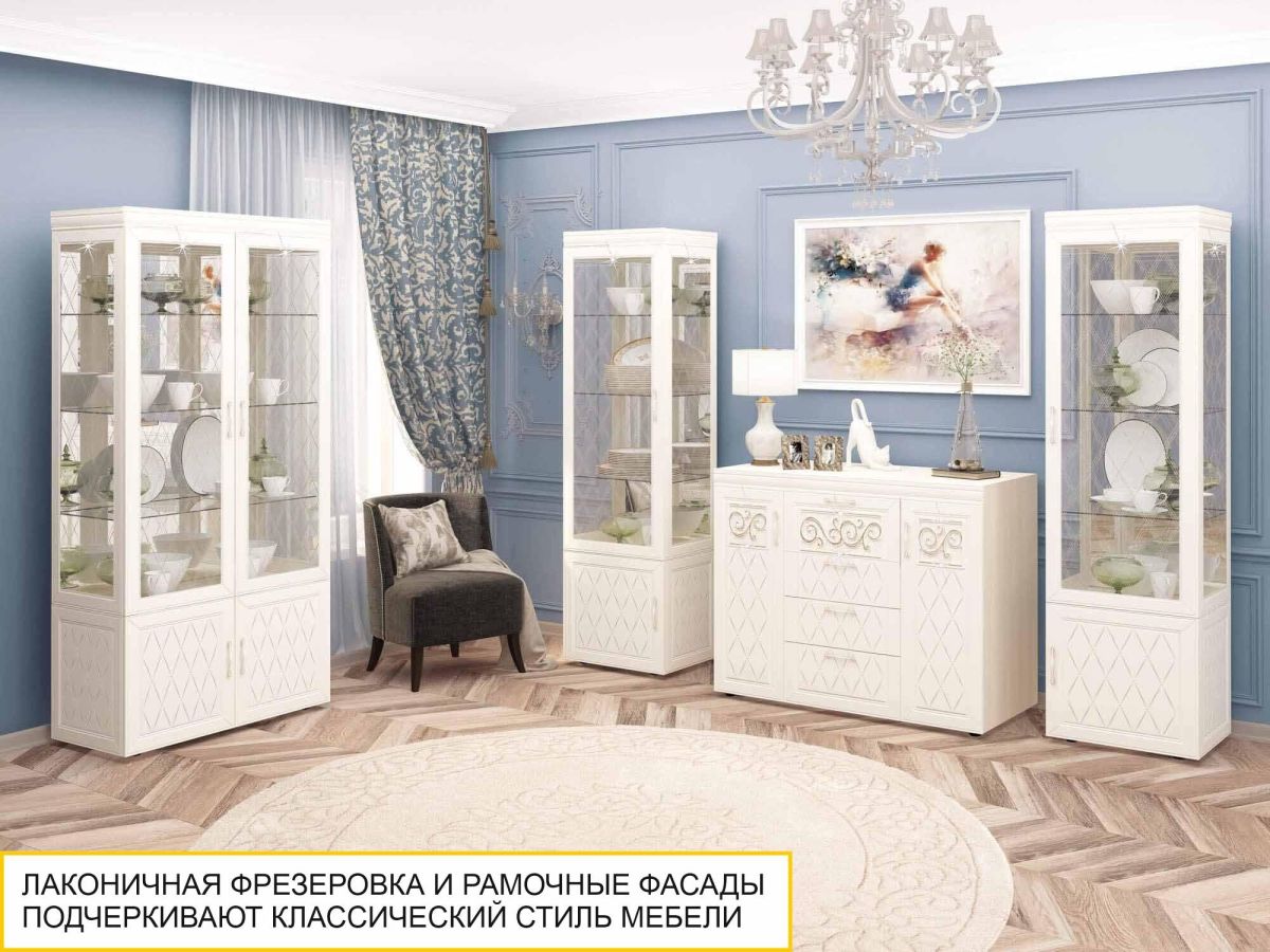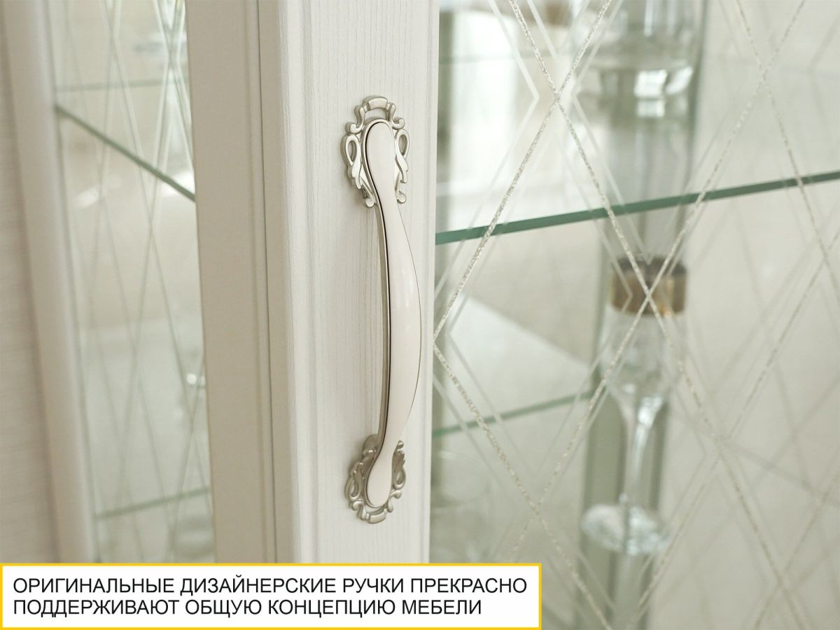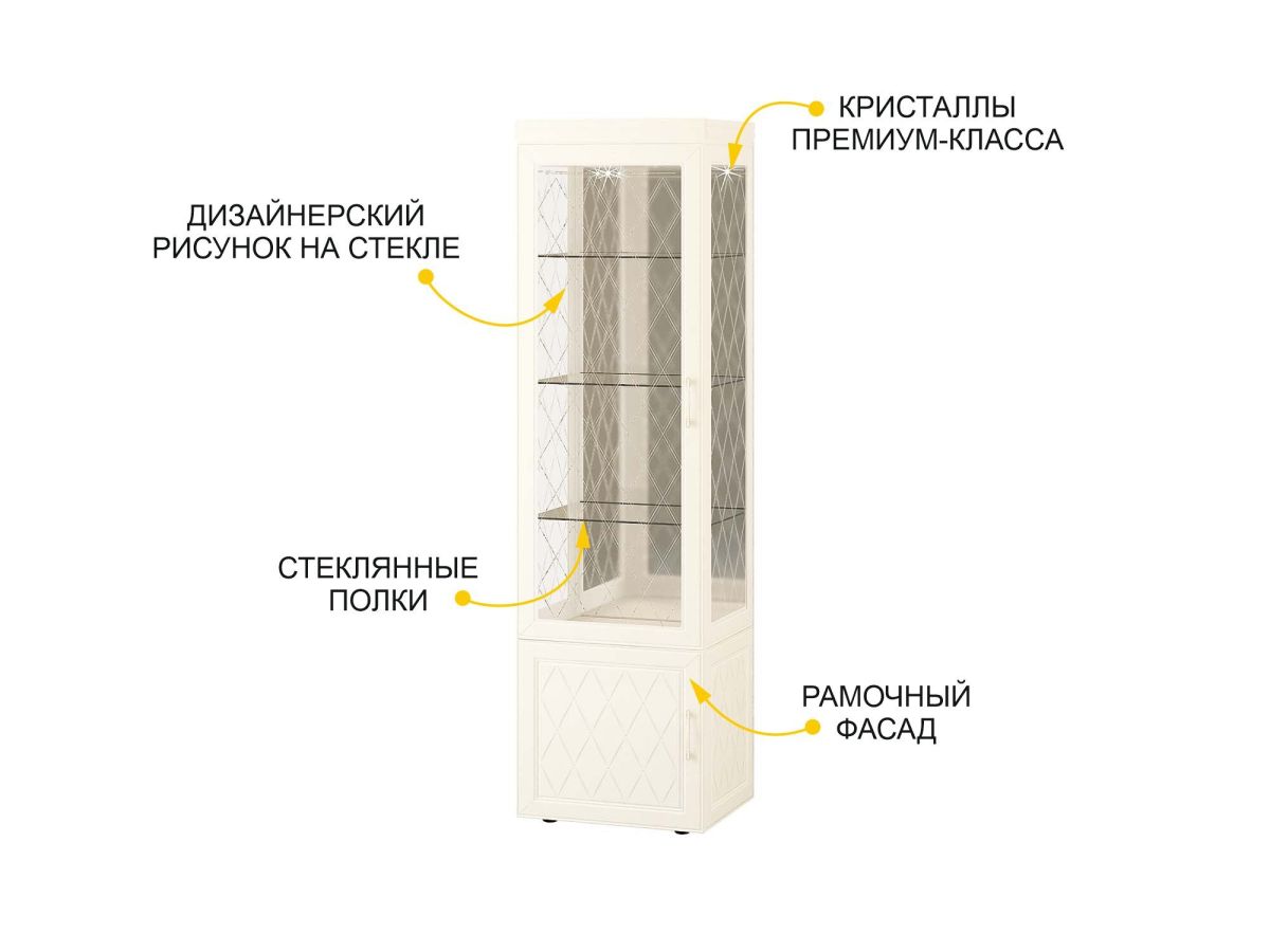 Сервант однодверный «Тиффани 600.08» является изюминкой модульной программы «Тиффани». Нежные светлые фасады и изысканный ажурный декор с кристаллами премиум-класса — отличительная черта данной коллекции.