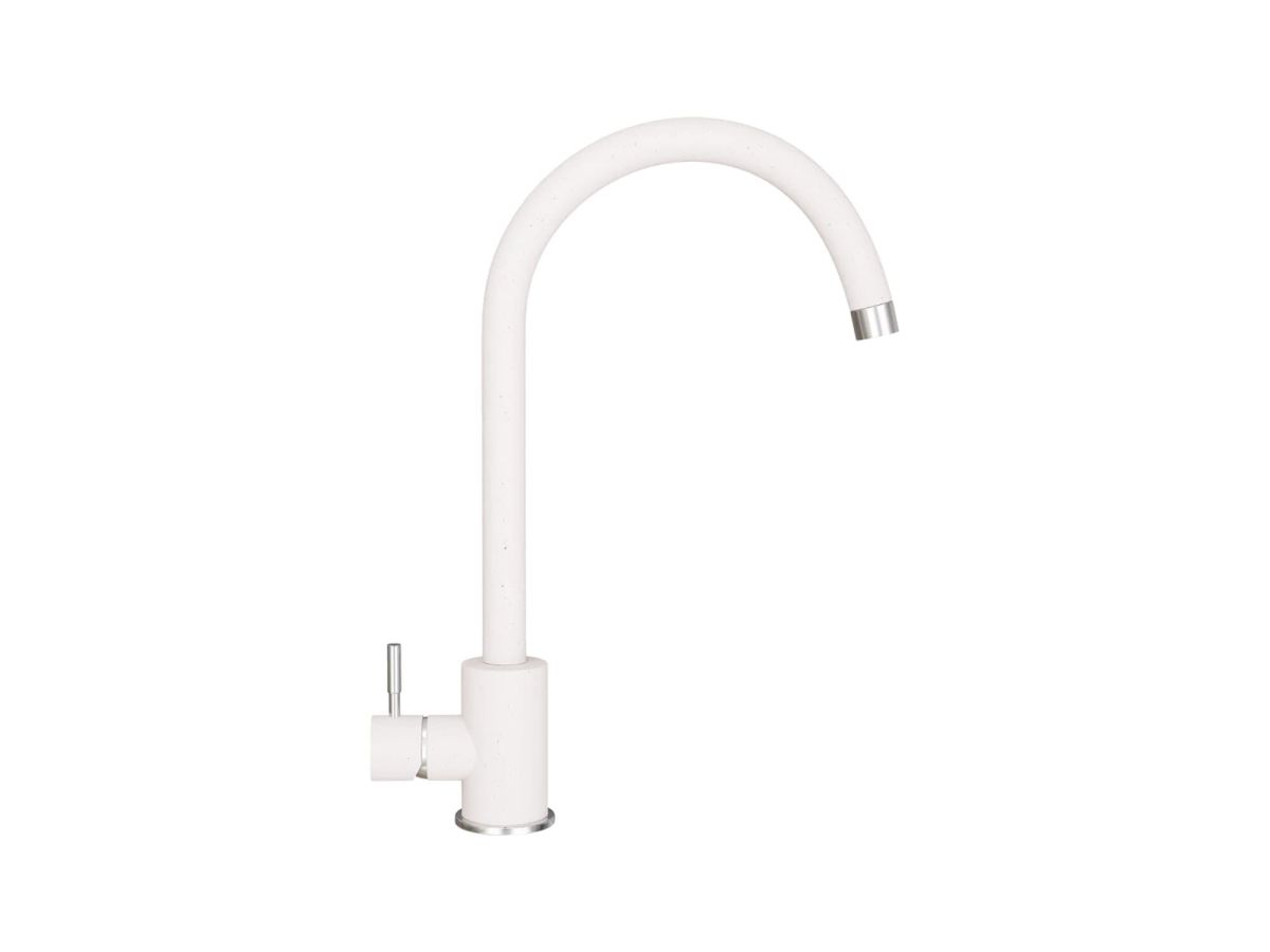 Нежный белый оттенок с едва заметными вкраплениями подчеркивает элегантность и утонченность смесителя. Текстура «гранит» напоминает природный камень. Такой дизайн отлично вписывается в различные стили кухонь, создавая ощущение естественной красоты и изысканности.