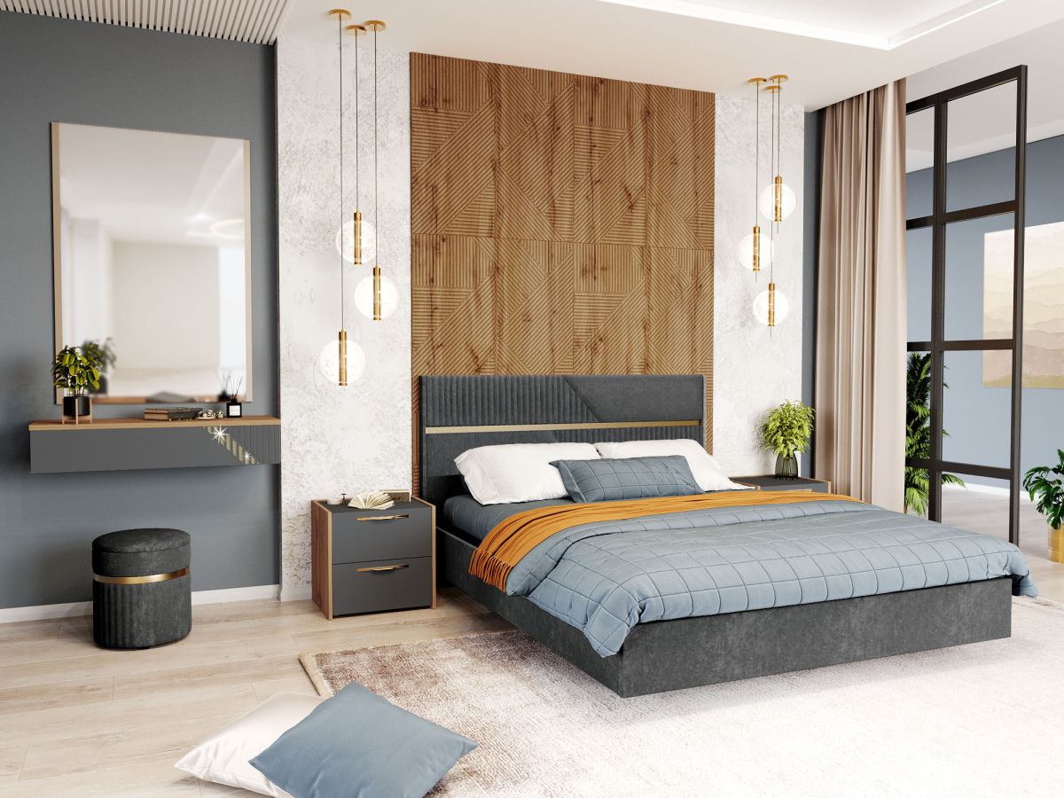 Спальный гарнитур «Монако 902 120» - это образец элегантного стиля и утонченного вкуса. Сочетание матовой графитовой поверхности фасадов с благородной древесной текстурой создает особую атмосферу гармонии и комфорта.