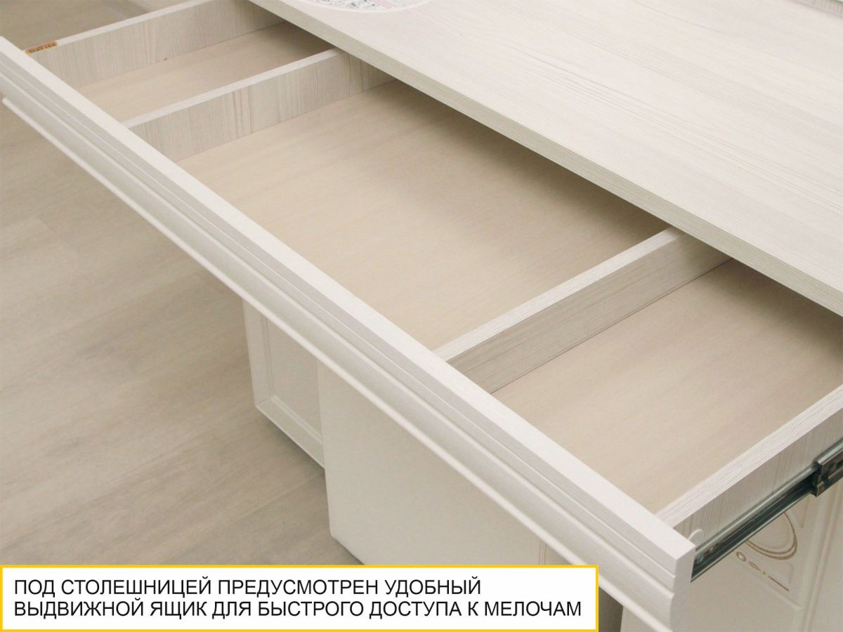 - Туалетный столик оснащен множеством полочек и удобным выдвижным ящиком для хранения мелочей.