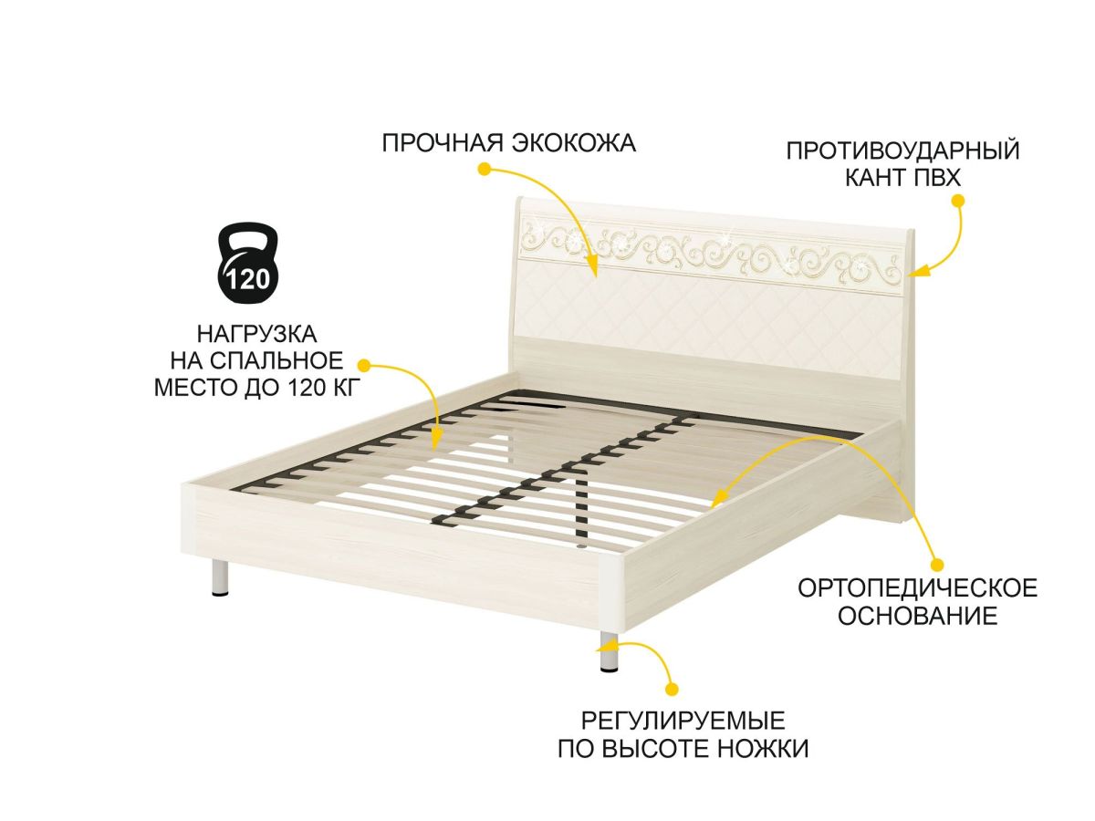 Размер спального места – 1600x2000 мм. Максимальная распределённая нагрузка на спальное место – до 120 кг.