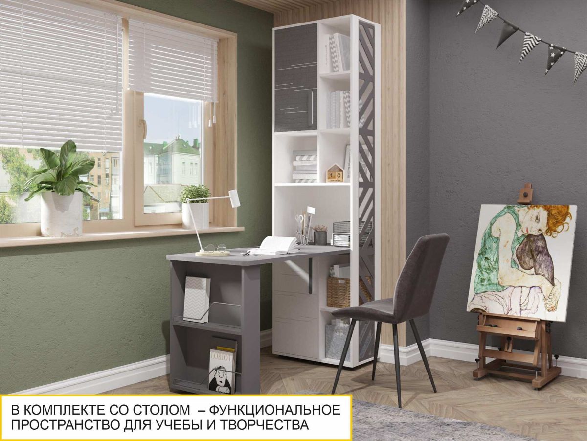 • В комплекте со столом модуль превращается в функциональное место для учебы, работы или творчества.