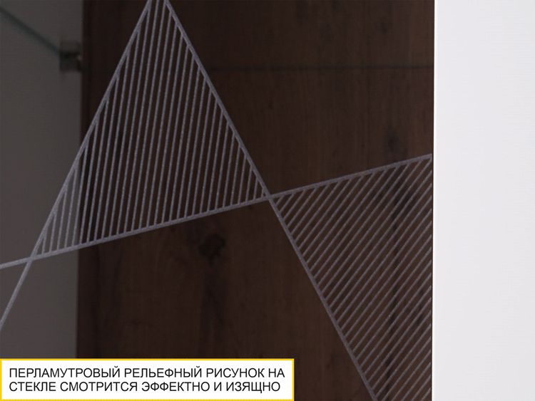 - Стеллаж с тонированным стеклом и перламутровым рисунком смотрится лаконично, эффектно и изящно.