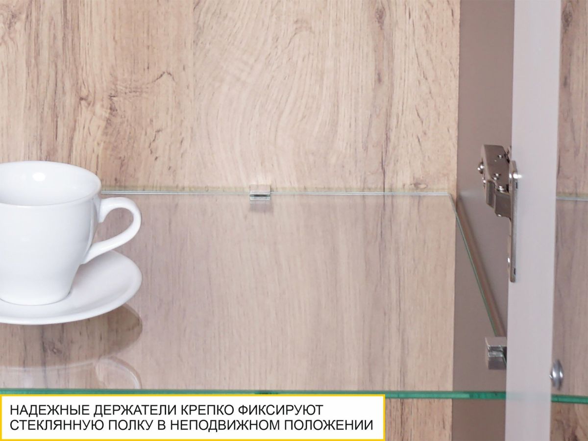 - В верхней части стеллажа установлены вкладные стеклянные полки. Каждую стеклянную полку надежно фиксируют 4 современных держателя с силиконовой вставкой, которые предотвращают смещение и падение полок.