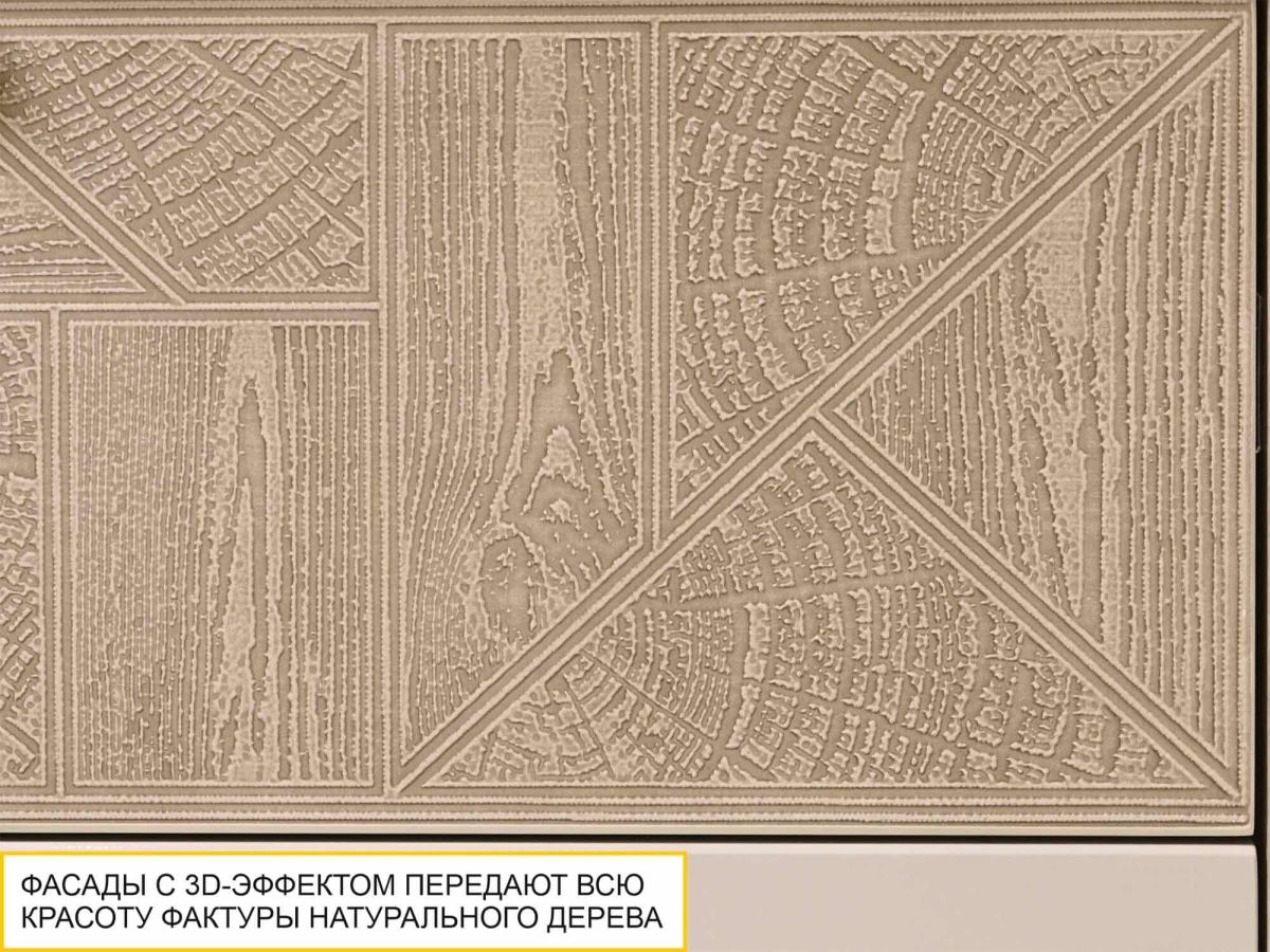 • Фасады декорированы фактурной патинированной вставкой с имитацией спила натурального дерева. Патина придает изделиям благородный внешний вид. Декор не стирается и не тускнеет со временем.