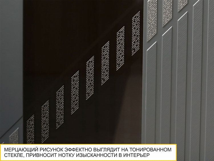 - Мерцающий рисунок на стекле витрины плавно переходит на фасад. Тонированное стекло эффектно подчеркивает этот рисунок, привносит нотку изысканности и элегантности в интерьер.