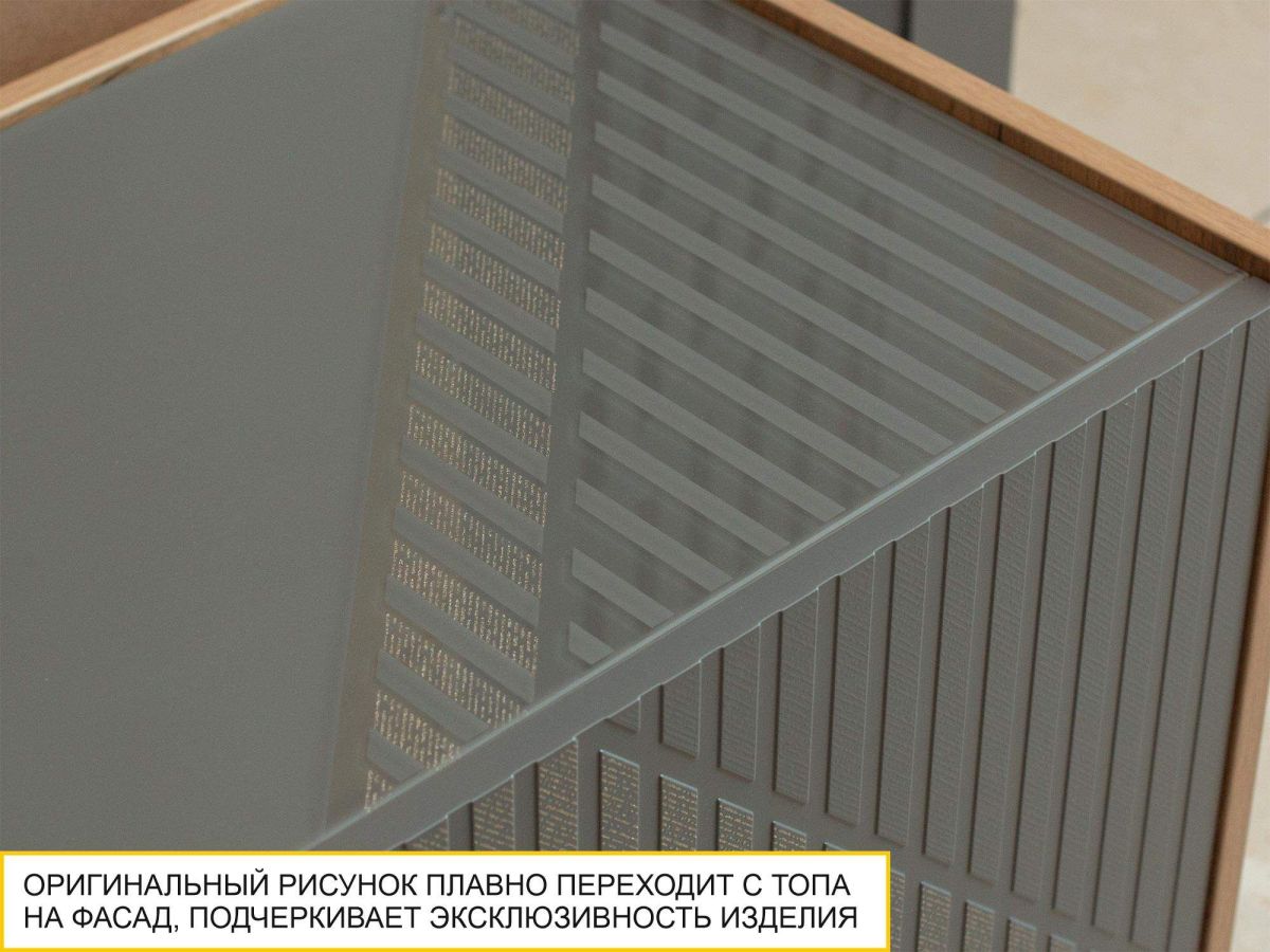 - Верхняя поверхность тумбы декорирована стеклянной вставкой с авторским рисунком. Сочетание матовой и глянцевой поверхности формирует оригинальный узор, который плавно переходит в рисунок на фасаде. Благодаря наличию стекла на топе тумбы глиттерный рисунок не стирается и не выцветает со временем.