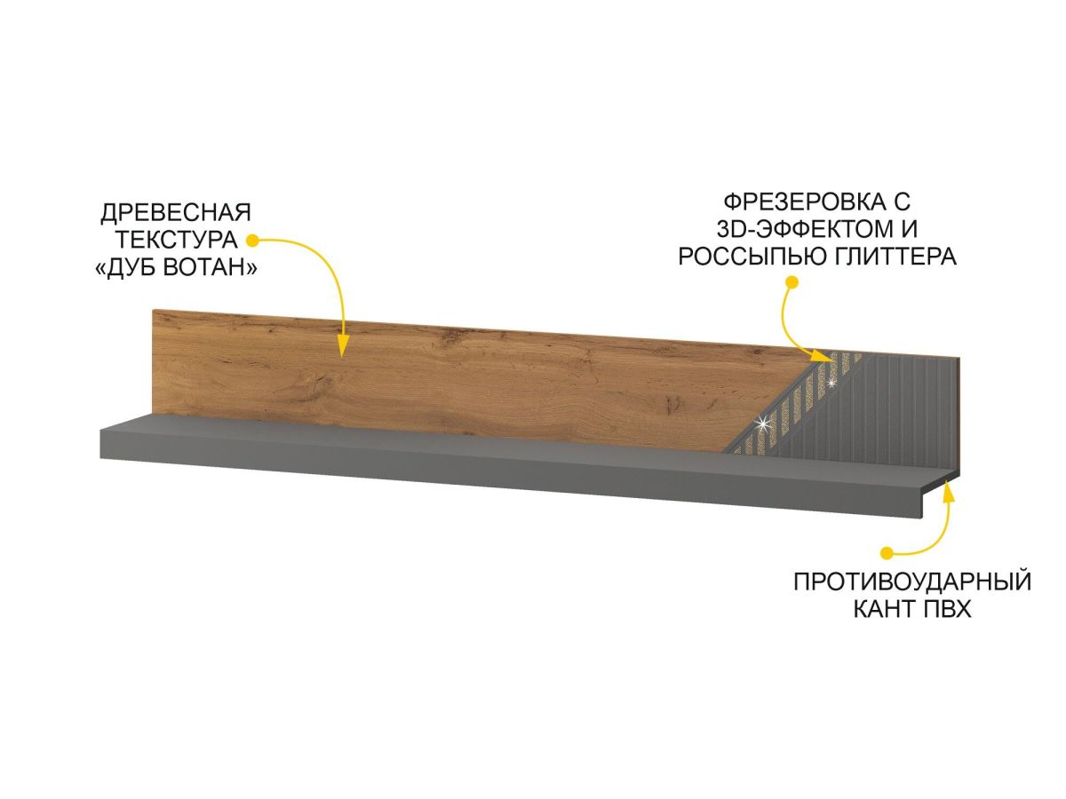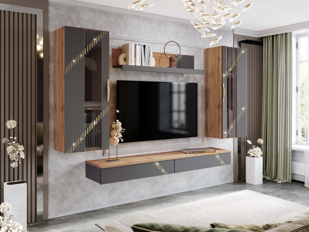 Стенка для гостиной «Монако 605 405» - это образец элегантного стиля и утонченного вкуса. Сочетание матовой графитовой поверхности фасадов с благородной древесной текстурой создает особую атмосферу гармонии и комфорта.