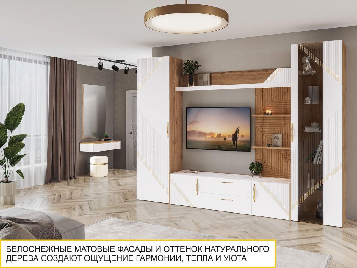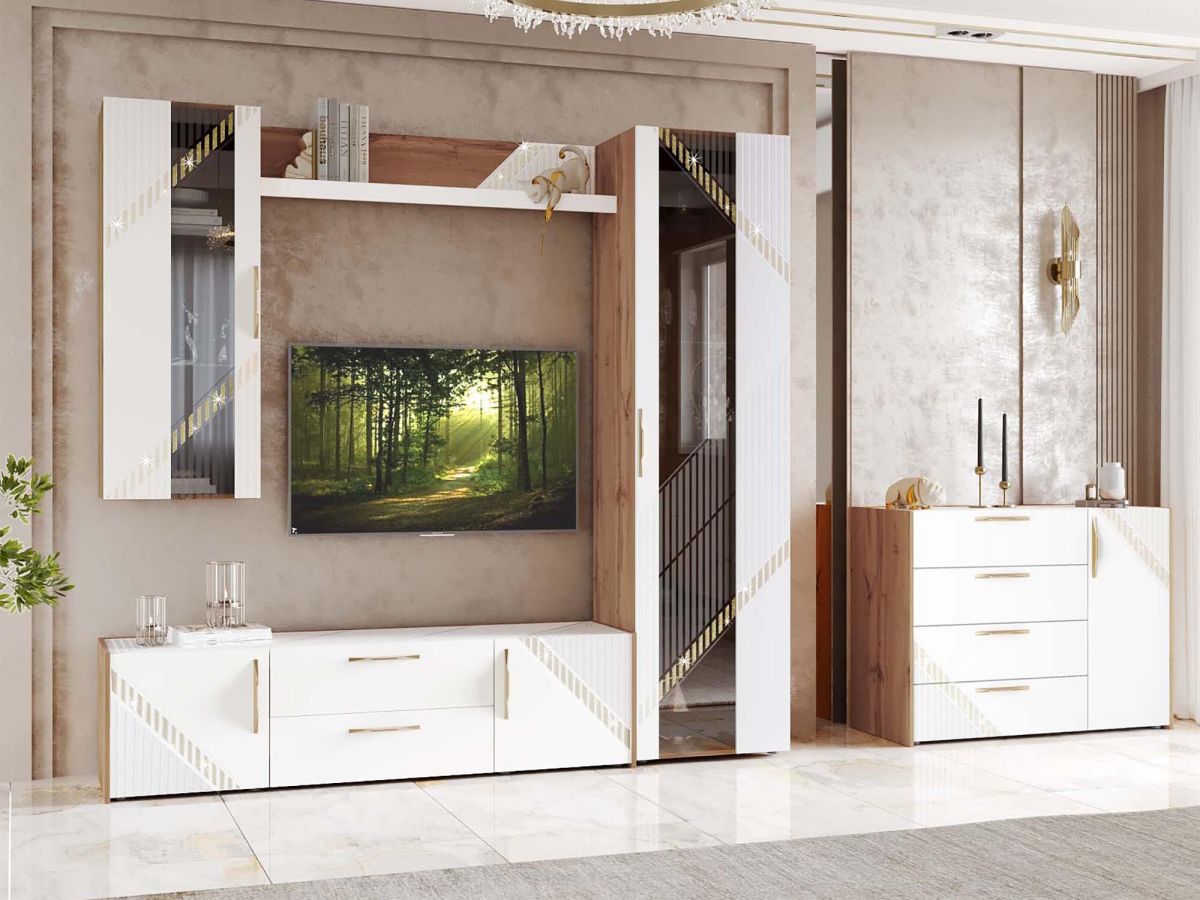 Стенка для гостиной «Монако 606 404» - это образец элегантного стиля и утонченного вкуса. Сочетание матовой белоснежной поверхности фасадов с благородной древесной текстурой создает особую атмосферу гармонии и комфорта.