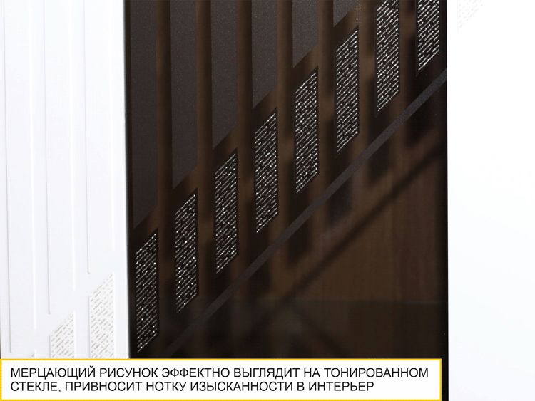 - Мерцающий рисунок на стекле витрин плавно переходит на фасад. Тонированное стекло эффектно подчеркивает этот рисунок, привносит нотку изысканности и элегантности в интерьер.