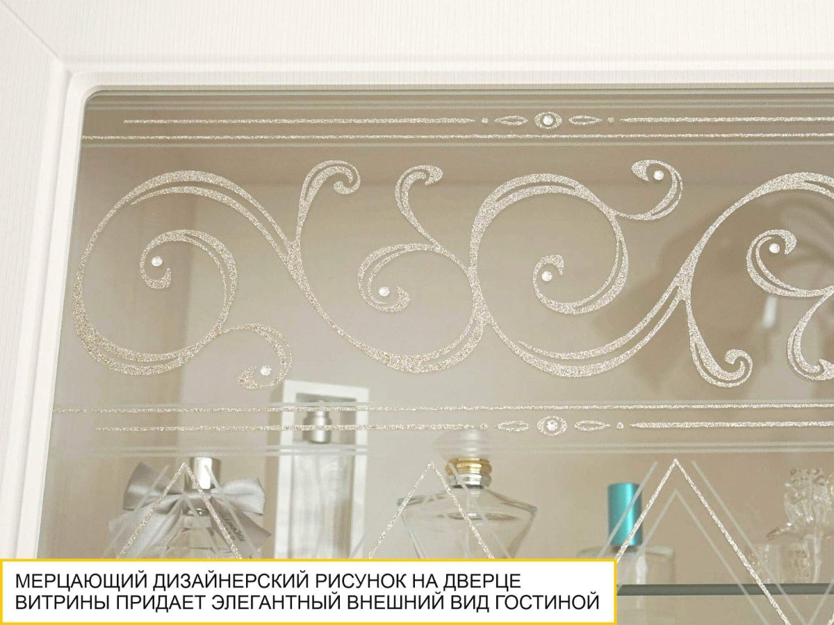 - Стеклянные дверцы полки и витрины украшены мерцающим дизайнерским рисунком, что добавляет гостиной элегантности. Покрытие декора устойчиво к истиранию и не выцветает со временем.