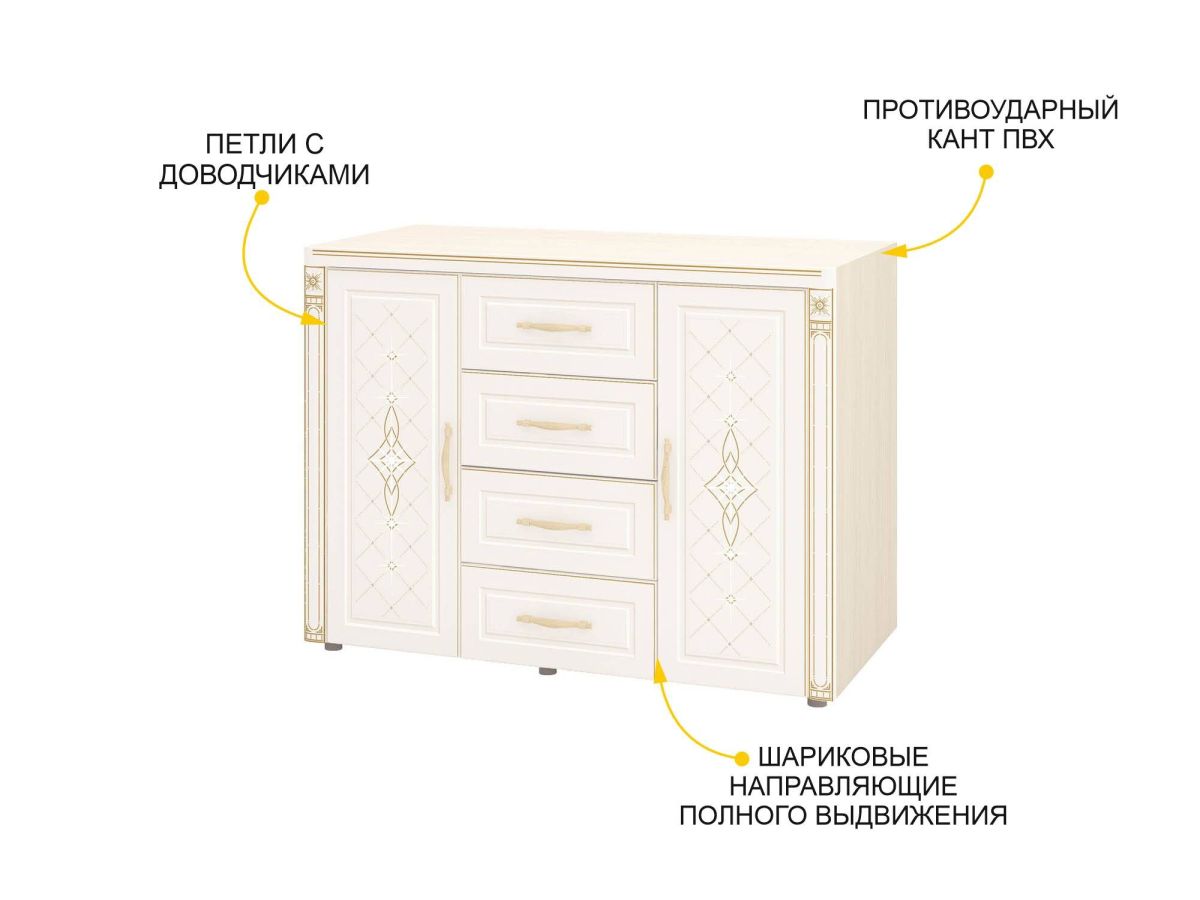 - Комод оснащен бесшумными шариковыми направляющими полного выдвижения, благодаря чему мебелью приятно и удобно пользоваться.