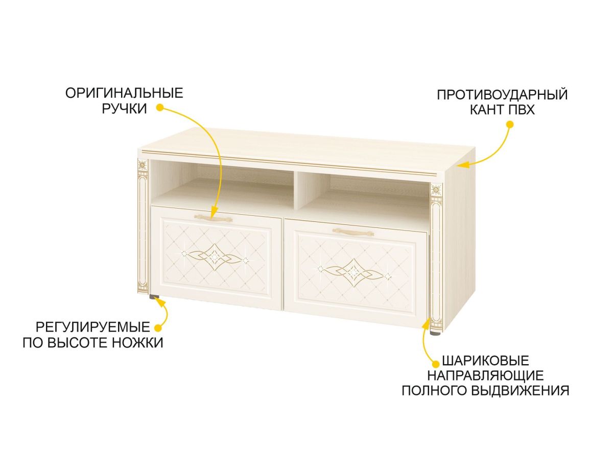 - ТВ-тумба оснащена бесшумными шариковыми направляющими полного выдвижения, благодаря чему мебелью приятно и удобно пользоваться.