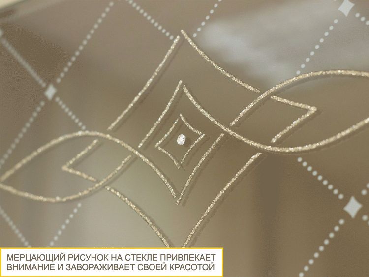 - Мерцающий рисунок на стекле притягивает взгляд и завораживает своей красотой. Глиттер создает невероятные переливы и блеск, что придает гостиной эксклюзивный внешний вид.