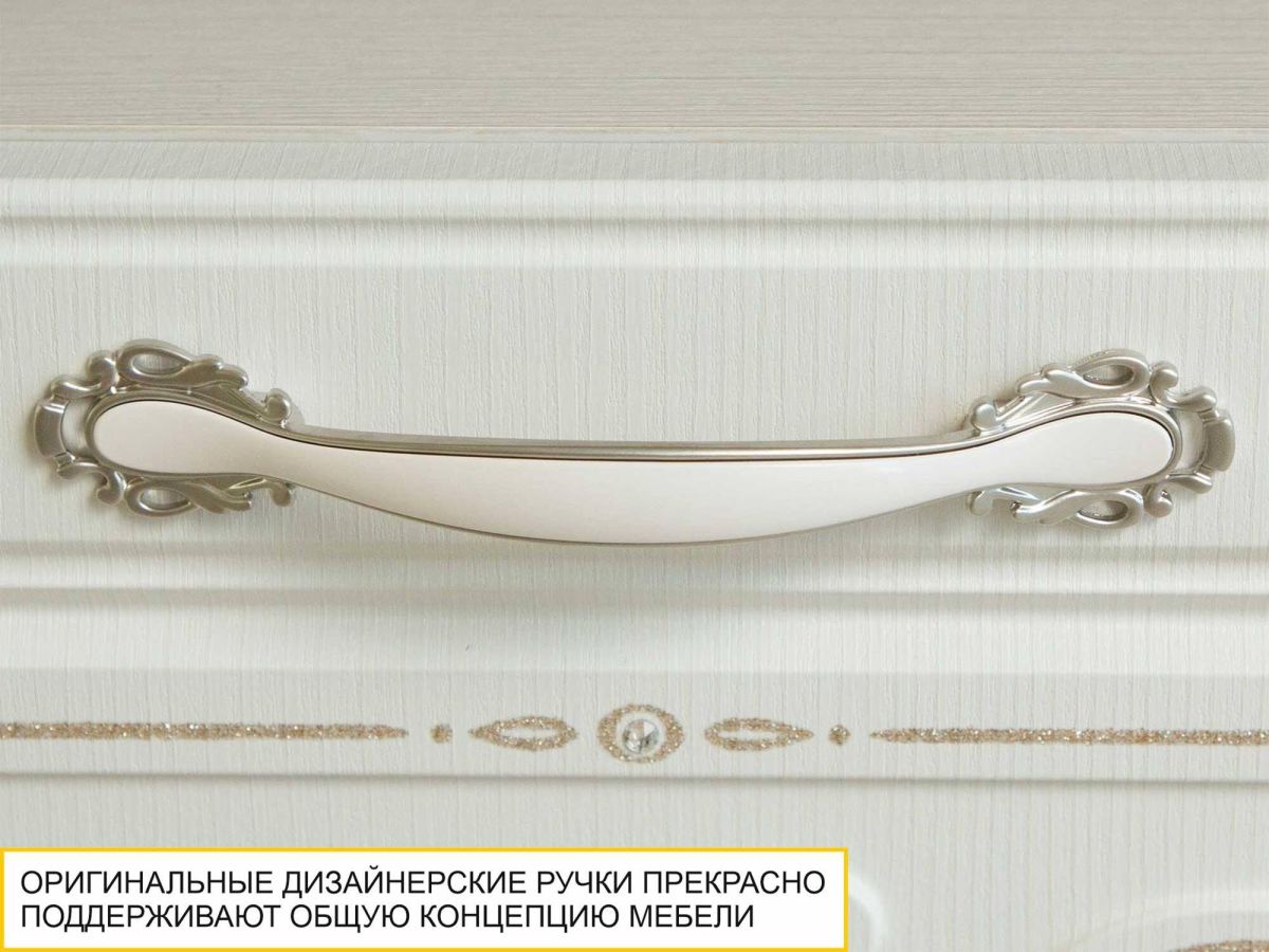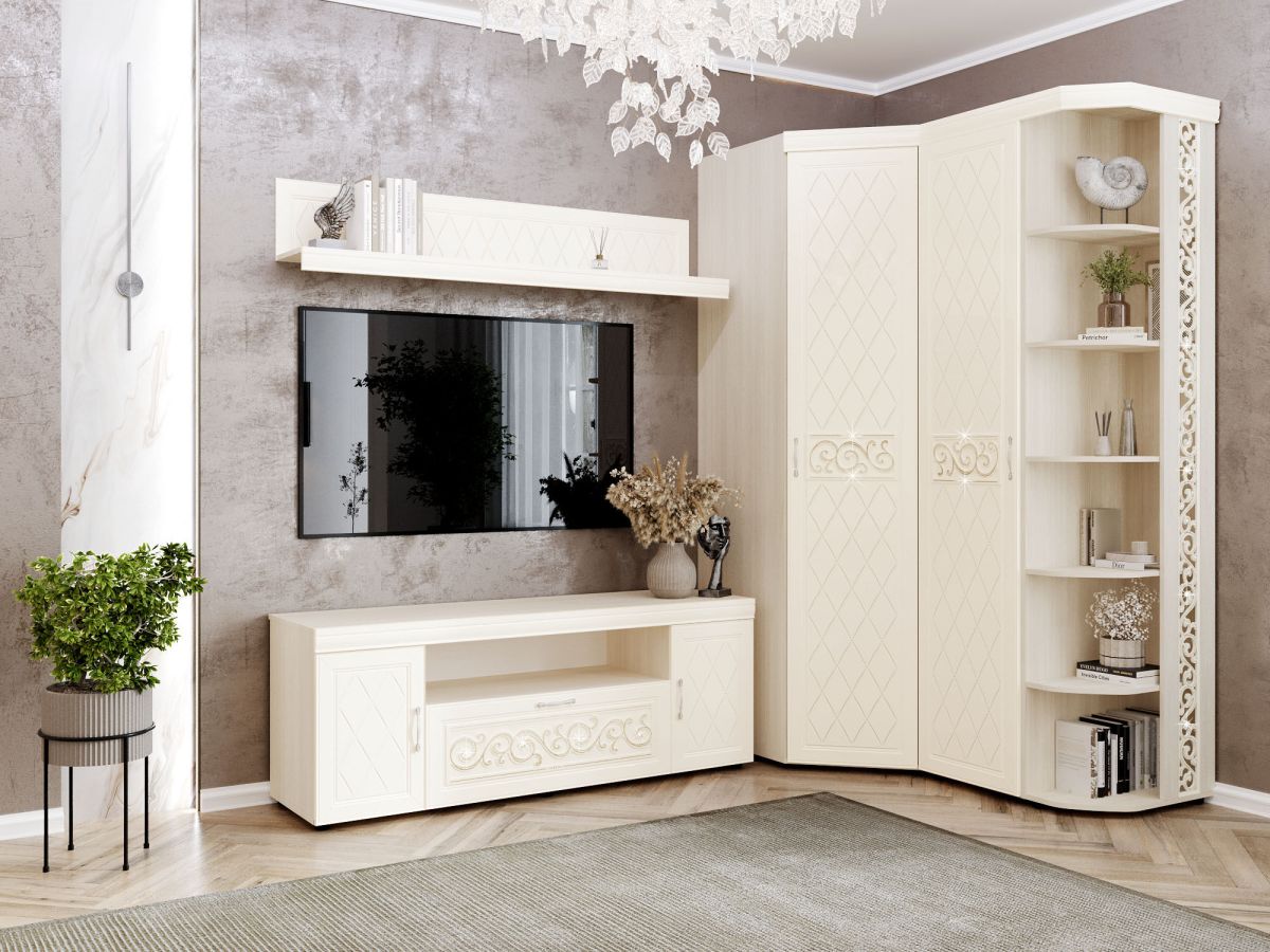 Стенка для гостиной «Тиффани 600 409» – атмосфера изысканности и нежности у Вас дома. Светлые фасады и ажурный мерцающий декор с кристаллами премиум-класса – отличительная черта данной коллекции. Функциональная стенка позволяет с удобством хранить вещи и оборудовать ТВ-зону.
