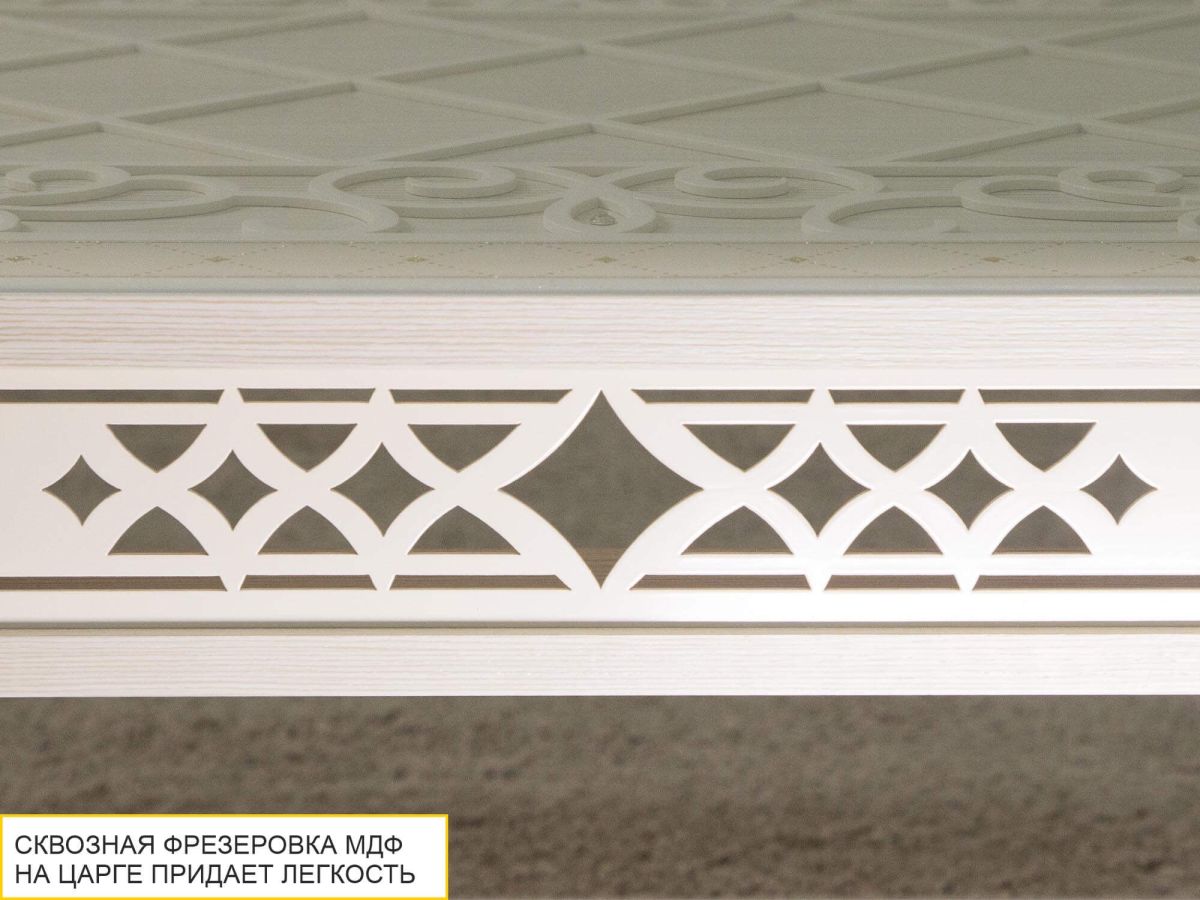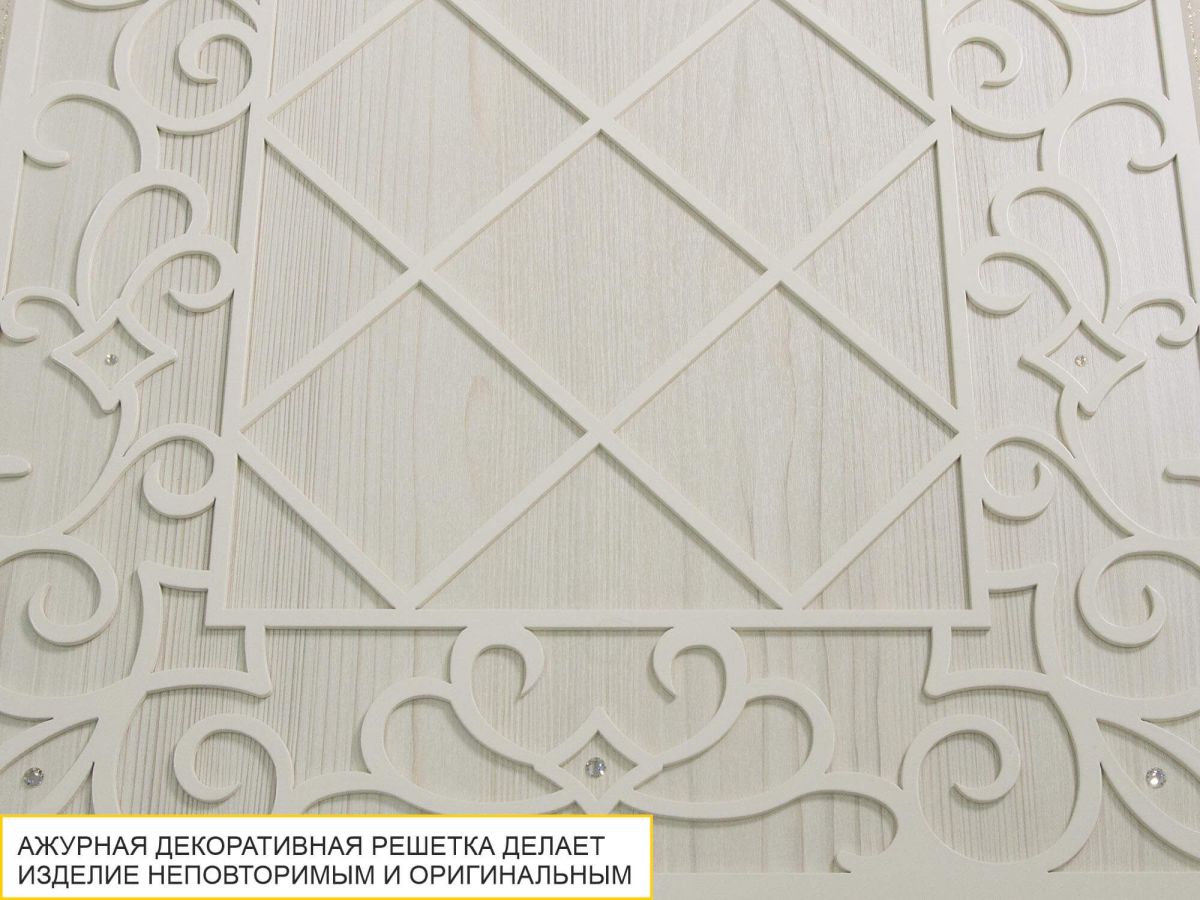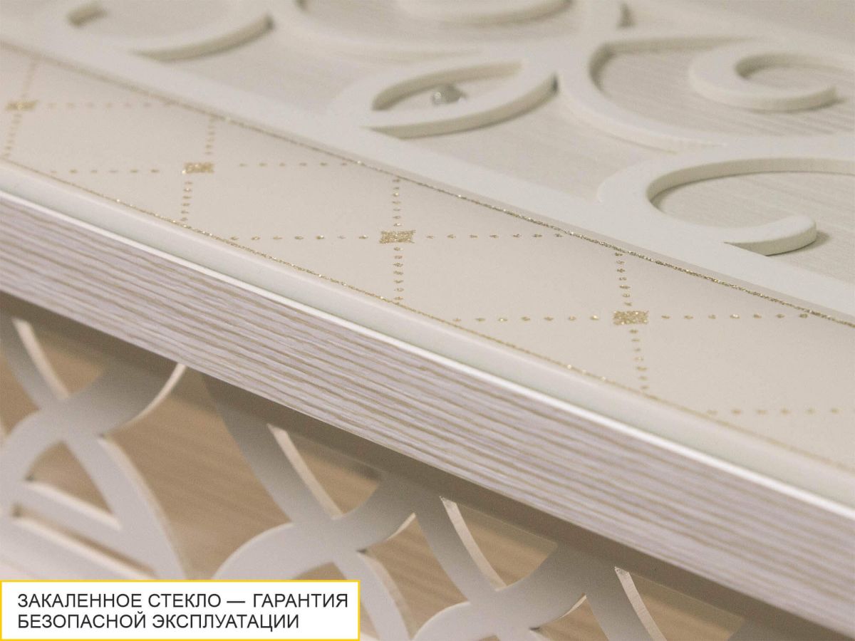 - Ажурная декоративная решетка под глянцевой стеклянной столешницей и на царге стола придает легкость изделию и делает его неповторимым и оригинальным.