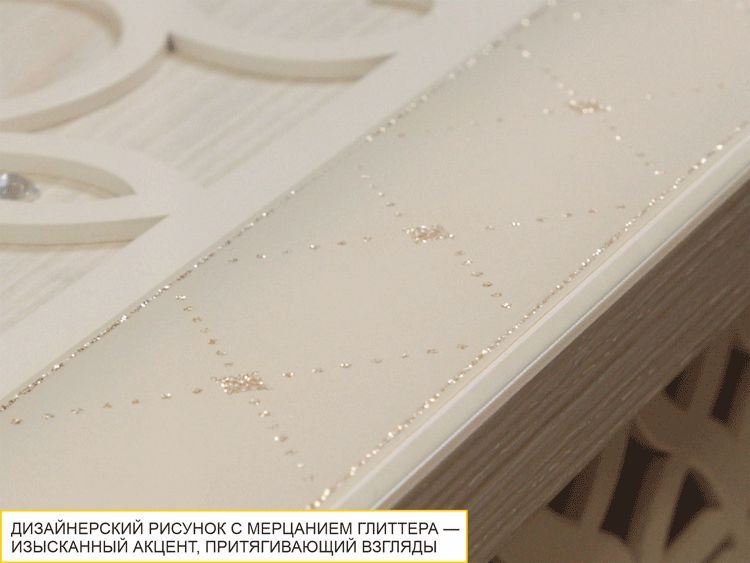 - Столик декорирован оригинальным глиттерным рисунком и кристаллами премиум-класса. Такой дизайн подчеркивает уникальность и привлекает внимание. Кристаллы сверхпрочно крепятся к столешнице. Рисунок не стирается и не выцветает со временем.