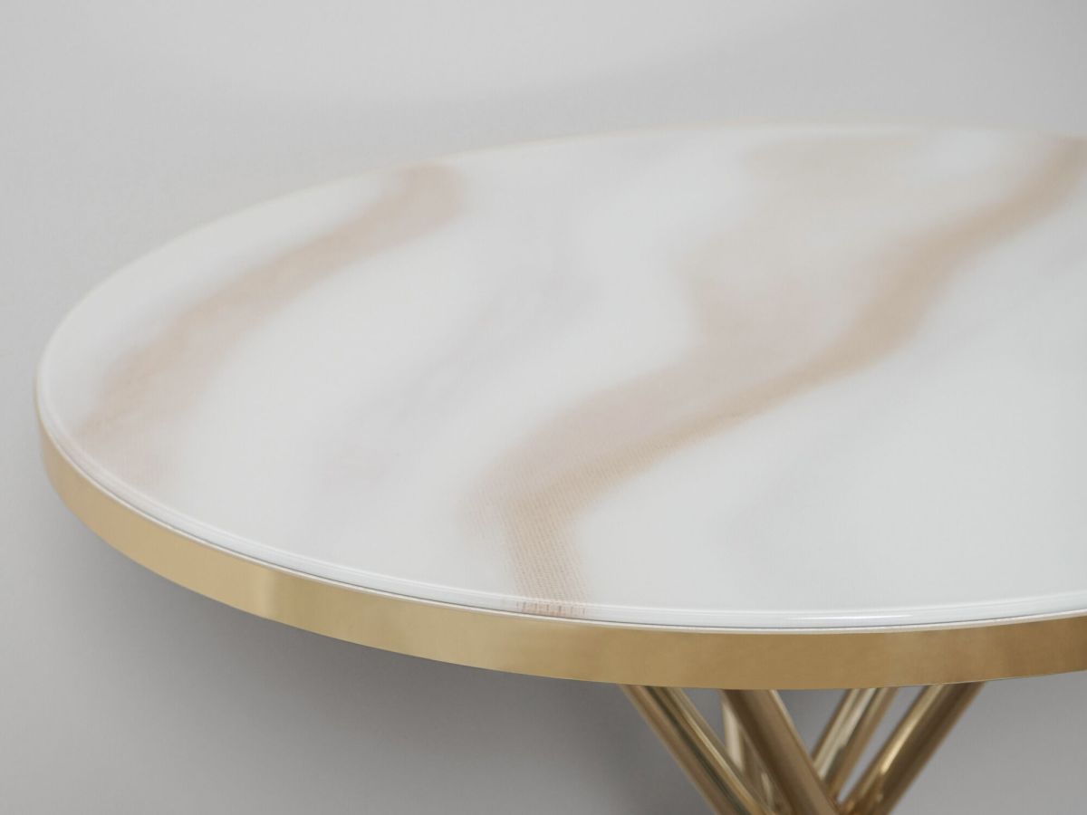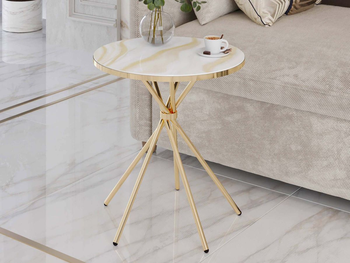 Столик выполнен в современном стиле, который удачно сочетает в себе элегантность и практичность. Круглая форма столешницы делает мебель удобной и комфортной в использовании. Комбинация «белого мрамора» и «глянцевого золота» выглядит стильно и эффектно. Идеальное решение для тех, кто хочет добавить в интерьер элегантности.