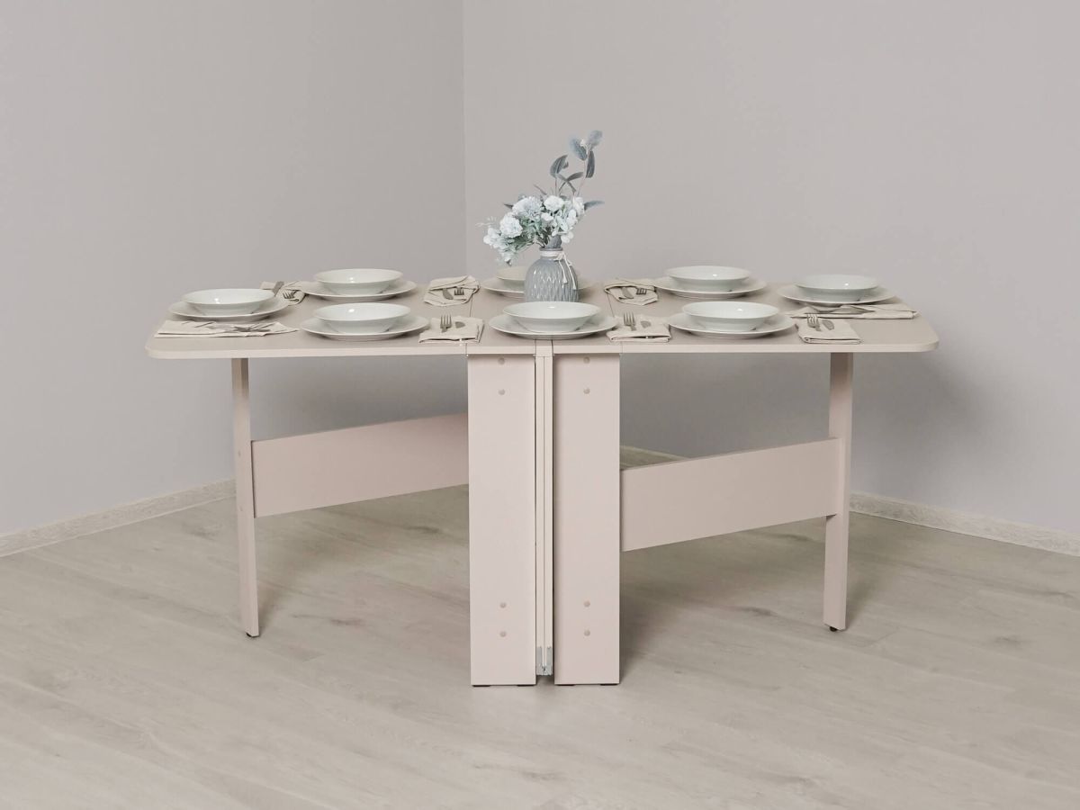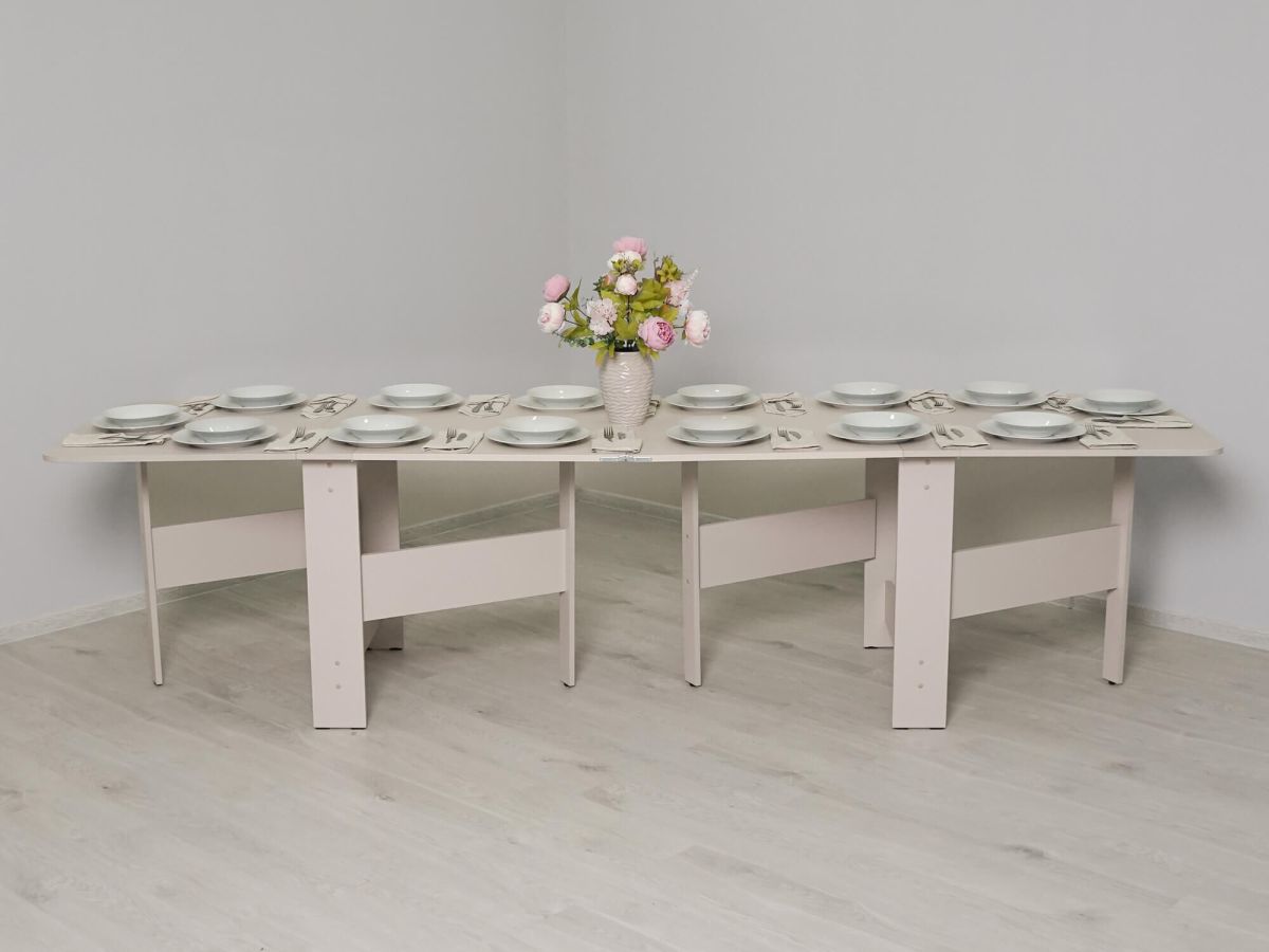 «Колибри 13 Кашемир/Белый песок» – это отличный складной стол для больших компаний. За считанные минуты стол превращается из узкой тумбы в большой обеденный стол длиной 3 метра, за которым можно разместить до 14-ти человек. Нежный цвет «Кашемир» создает ощущение уюта и спокойствия, гармонично сочетаясь с различными материалами и фактурами. Лаконичный дизайн подчеркивает простоту стола и его функциональность.