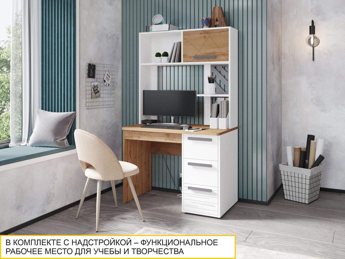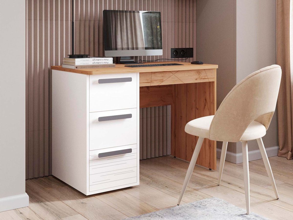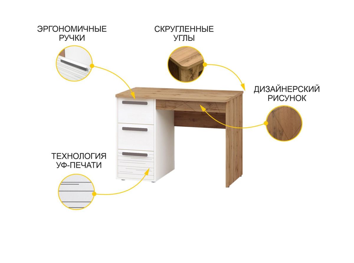 Стол «Аляска 503.26» является частью модульной программы «Аляска 503». Коллекция подростковой «Аляска 503» - это современное и функциональное пространство для жизни и учебы. Сочетание белоснежных фасадов с теплым оттенком натурального дерева создает стильный образ коллекции, а универсальный дизайн отлично подойдет как юношам и девушкам, так и детям дошкольного возраста.