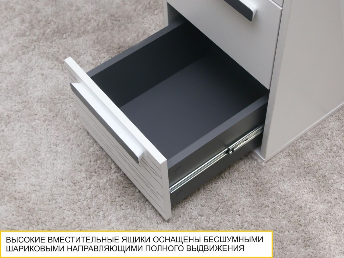 • Высокие вместительные ящики оснащены бесшумными шариковыми направляющими полного выдвижения. Качественная фурнитура гарантирует удобство и долговечность.