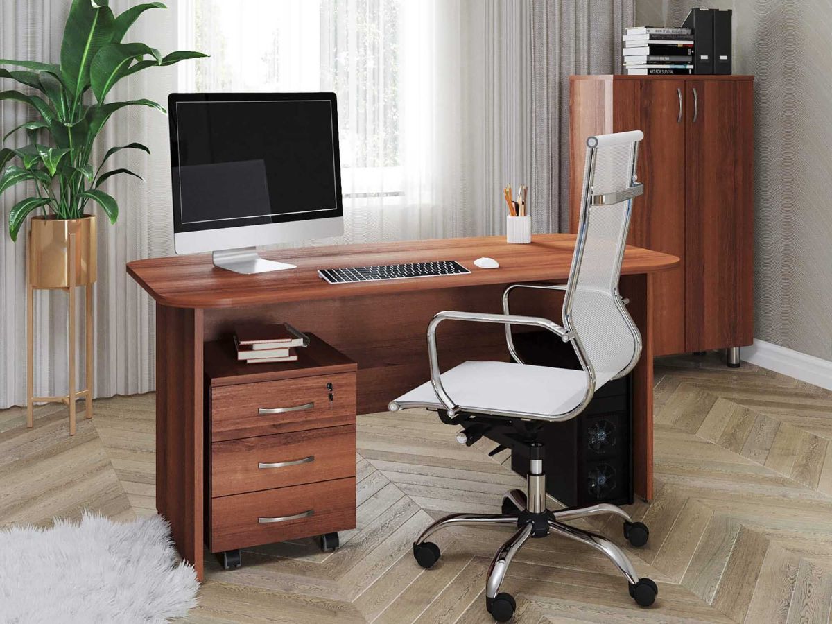 Стол руководителя «Лидер 82 264» укомплектован тумбой. Комплект является частью модульного набора для офиса «Лидер». Скругленные углы у стола обеспечивают безопасность и комфорт при эксплуатации. Ножки стола регулируются по высоте, что позволяет при установке компенсировать возможные неровности пола. Верхний ящик тумбы закрывается на ключ, в комплекте к замку тумбы прилагаются два ключа. Для удобного перемещения тумбы по офису вместо ножек у модуля установлены колесики.