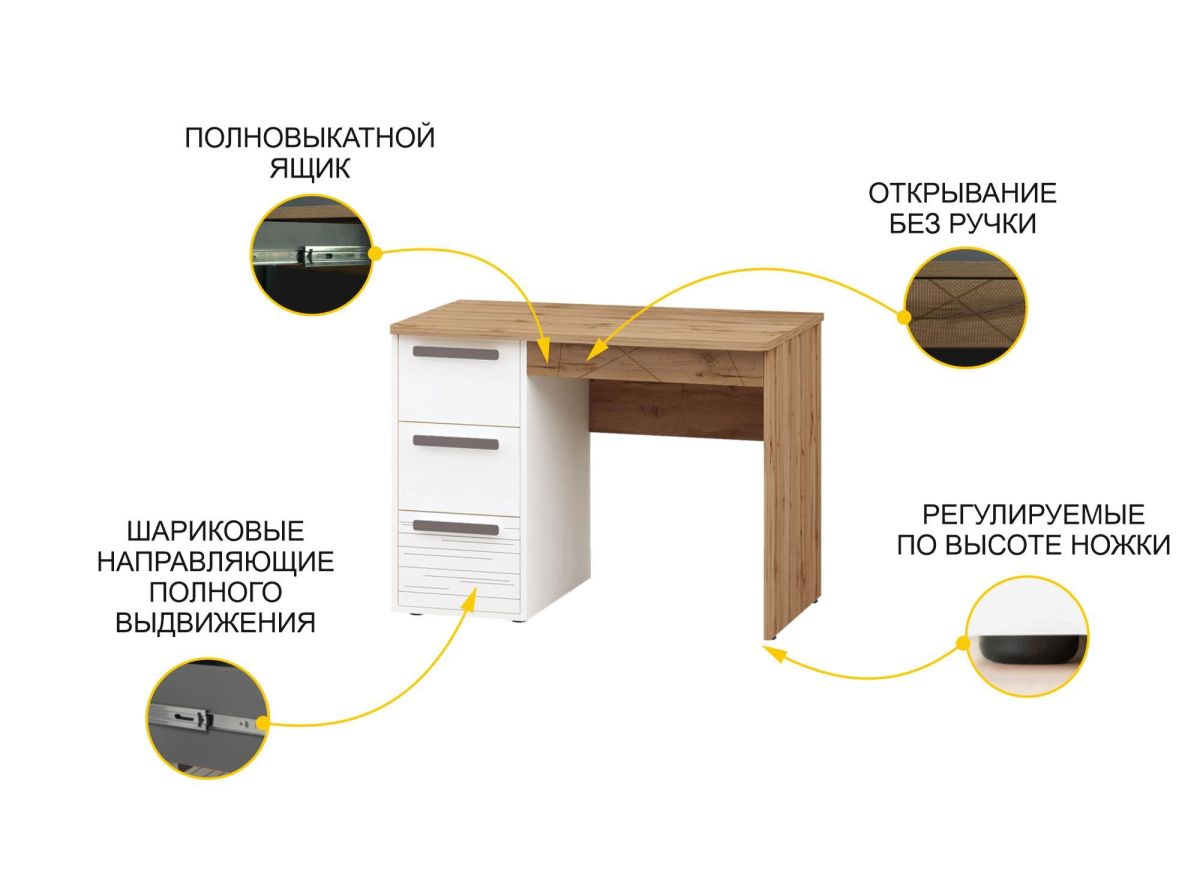 - Высокие вместительные ящики стола оснащены бесшумными шариковыми направляющими полного выдвижения. Качественная фурнитура гарантирует удобство и долговечность.