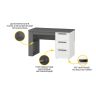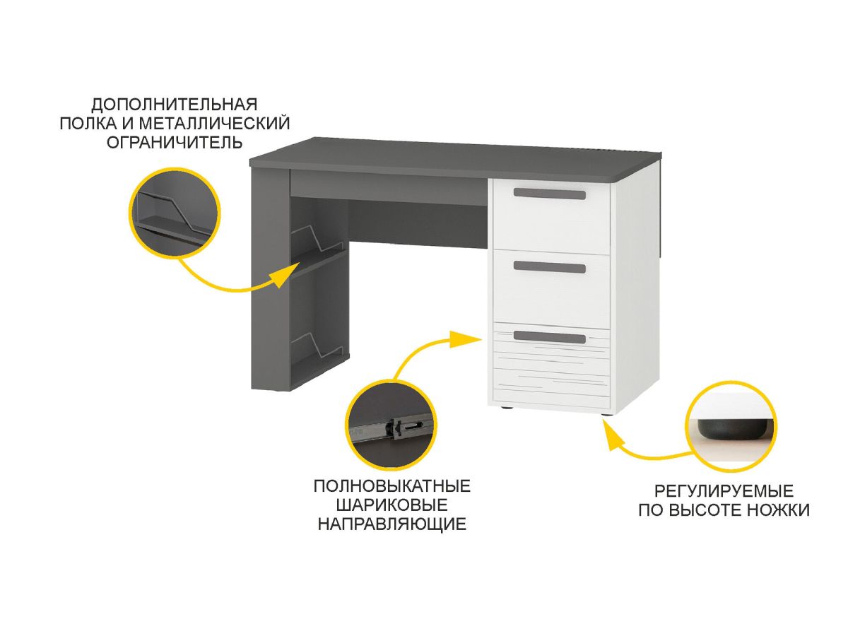 - В тумбе стола установлены три вместительных выдвижных ящика, укомплектованные полновыкатными шариковыми направляющими. Качественная фурнитура гарантирует удобство и длительный срок эксплуатации изделия.