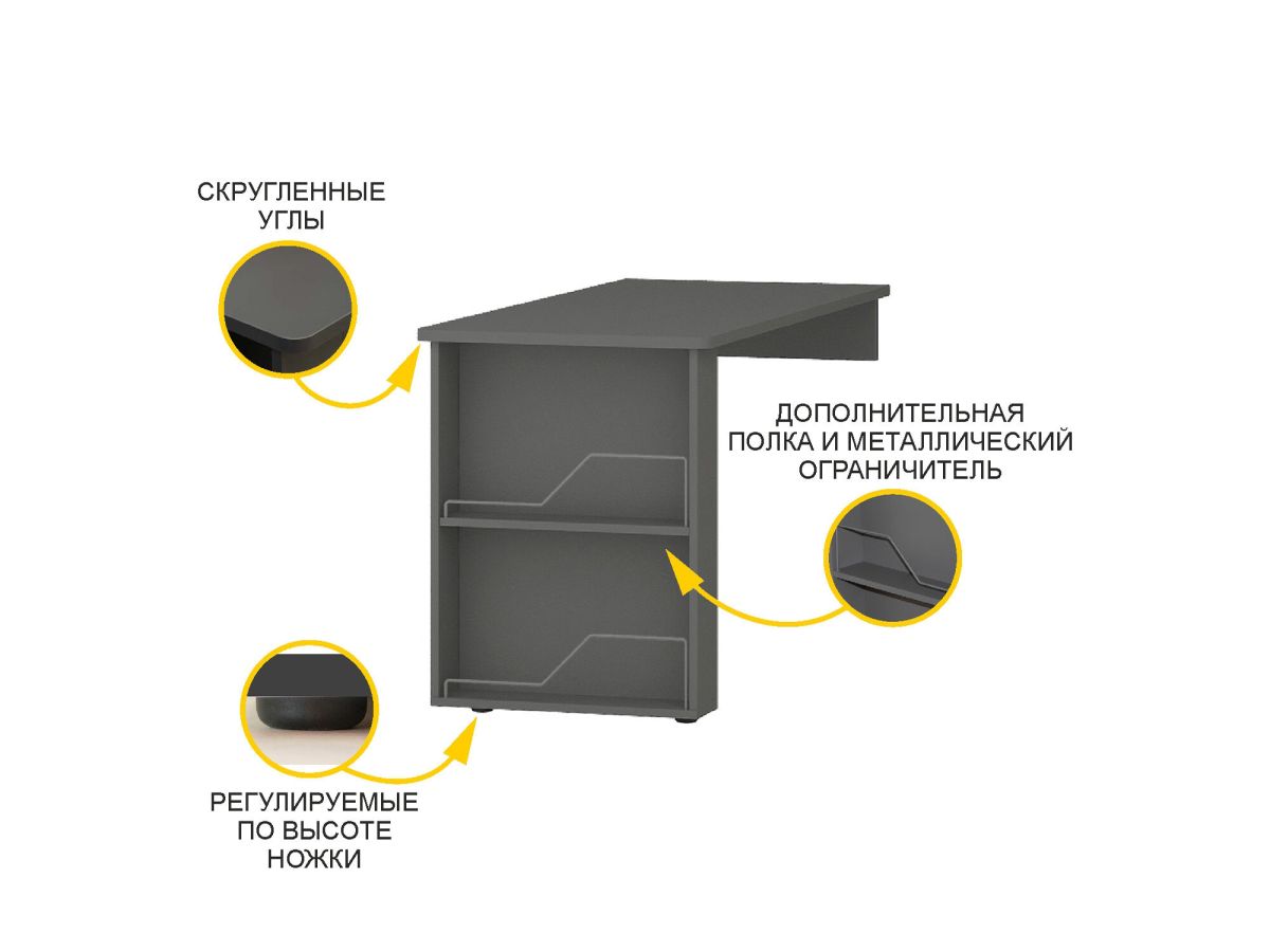 • Стол-стеллаж оснащен петлями с доводчиками, которые обеспечивают плавное и бесшумное закрывание. Качественная фурнитура гарантирует удобство и длительный срок эксплуатации изделия.