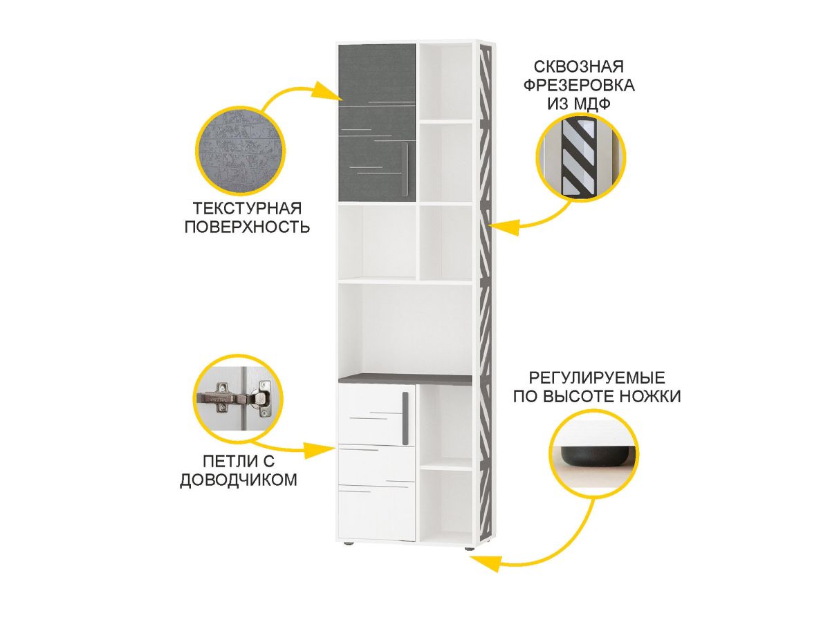 • Фасад в цвете «Графит» декорирован объемным тиснением. Объемная текстура придает дизайну мебели выразительности, создает глубину и приятные тактильные ощущения.