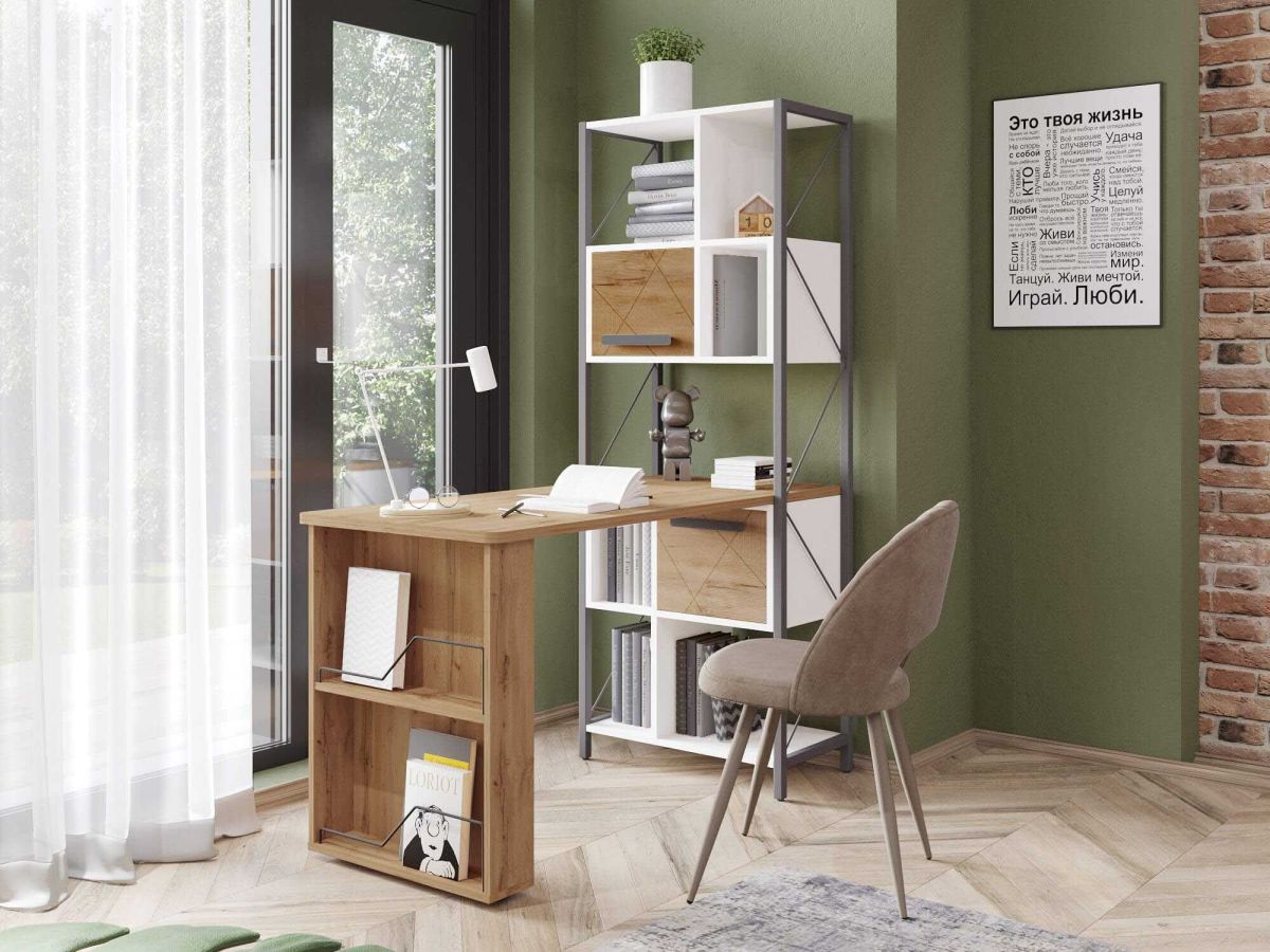 Стол-стеллаж «Аляска 503» — это современное и функциональное пространство для жизни и учебы. Сочетание белоснежных фасадов с теплым оттенком натурального дерева создает стильный образ коллекции, а универсальный дизайн отлично подойдет как юношам и девушкам, так и детям дошкольного возраста.