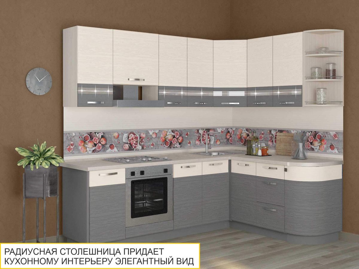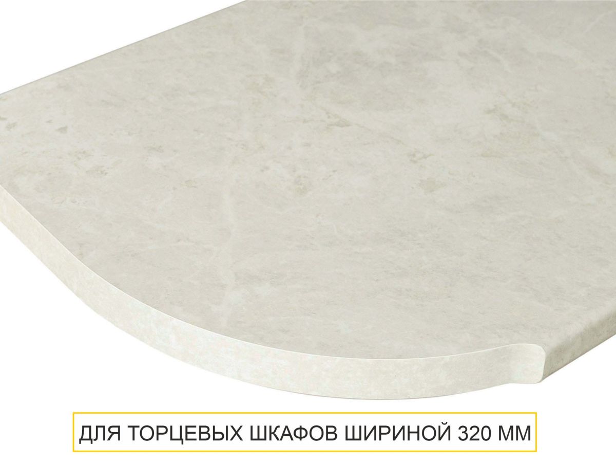 Радиусная столешница предназначена для гарнитуров с торцевыми модулями кухни. Плавные линии придают интерьеру современный и элегантный вид, а сама столешница позволяет более эффективно использовать пространство, особенно в угловых или нестандартных кухонных планировках, предоставляя дополнительную рабочую поверхность.
