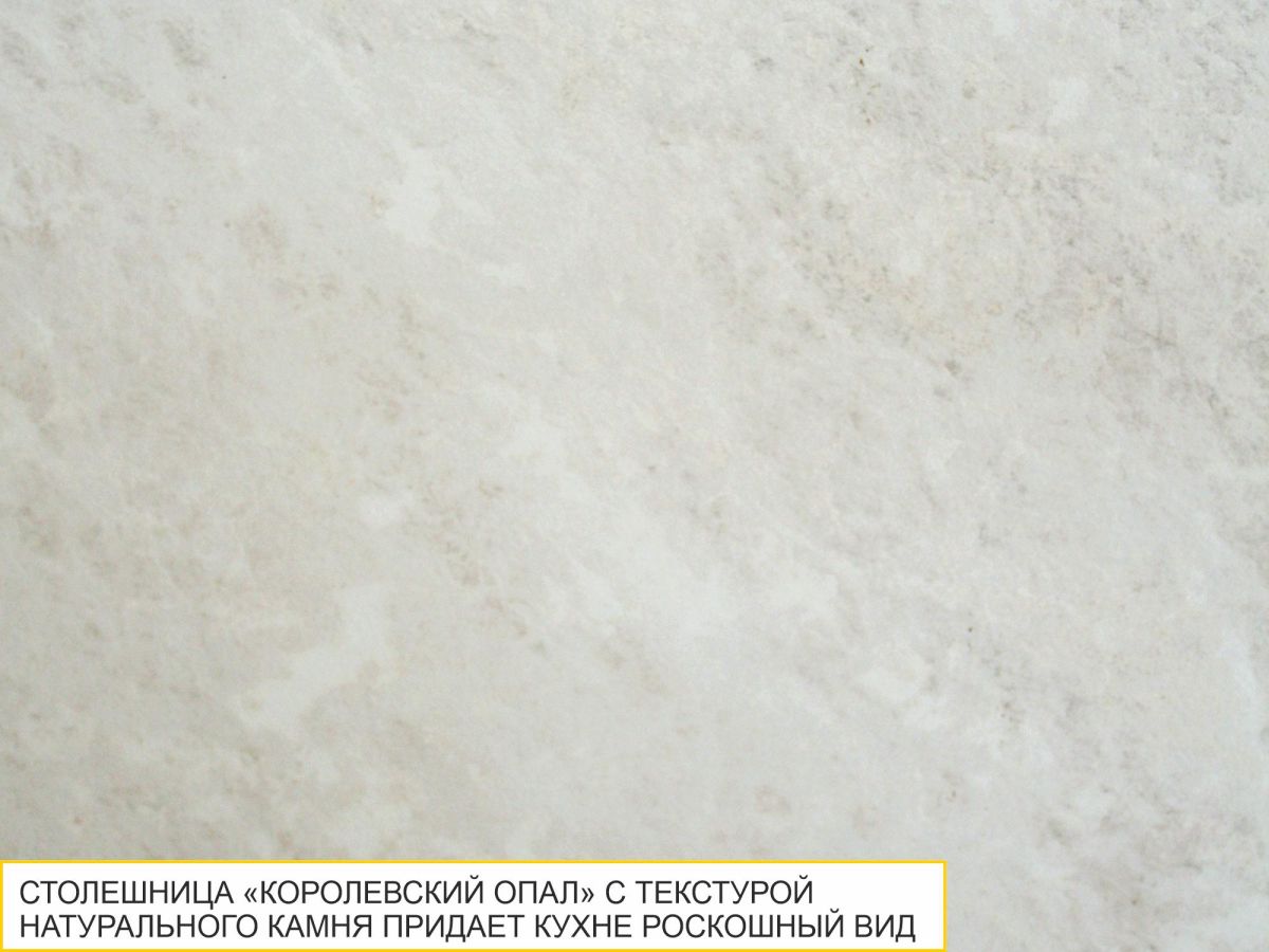 Декор столешницы «Королевский опал» отличается сложным и неоднородным узором. Нежный бежевый тон с мягкими плавными переходами от светлых оттенков к более темным создает эффект мраморности. Такая текстура, напоминающая природный камень, придает поверхности ощущение глубины и объема. «Королевский опал» будет выглядеть великолепно в сочетании с различными цветами кухонной мебели и станет центральным элементом дизайна для любого кухонного пространства, придавая ему роскошный и дорогой вид.