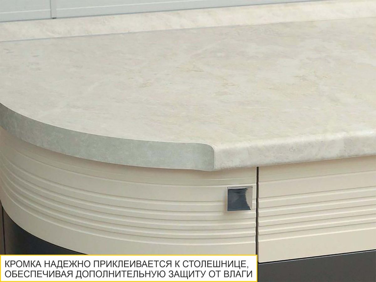 - Благодаря специальному оборудованию кромка надежно приклеивается к столешнице, обеспечивая защиту от повреждений, и препятствует проникновению влаги. Аккуратное кромление придает столешнице законченный и респектабельный вид, улучшая общее восприятие интерьера кухни.