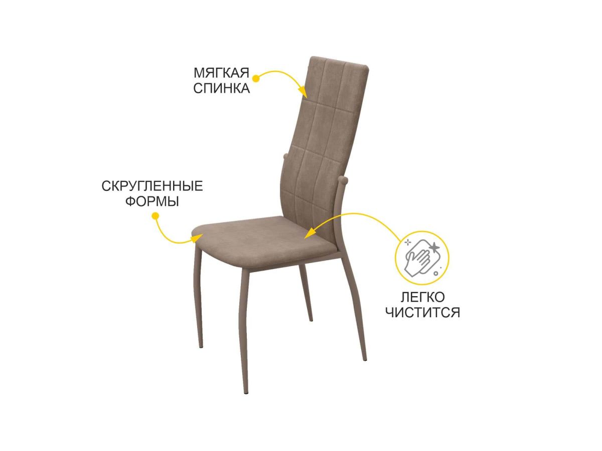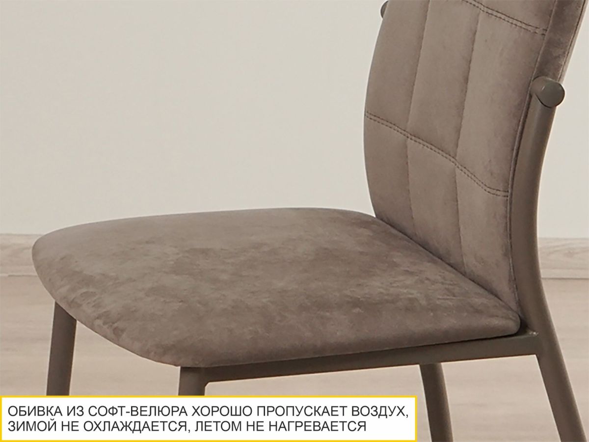 • Сиденье и спинка стула выполнены из приятного на ощупь софт-велюра, который не требует специального ухода и легко чистится.