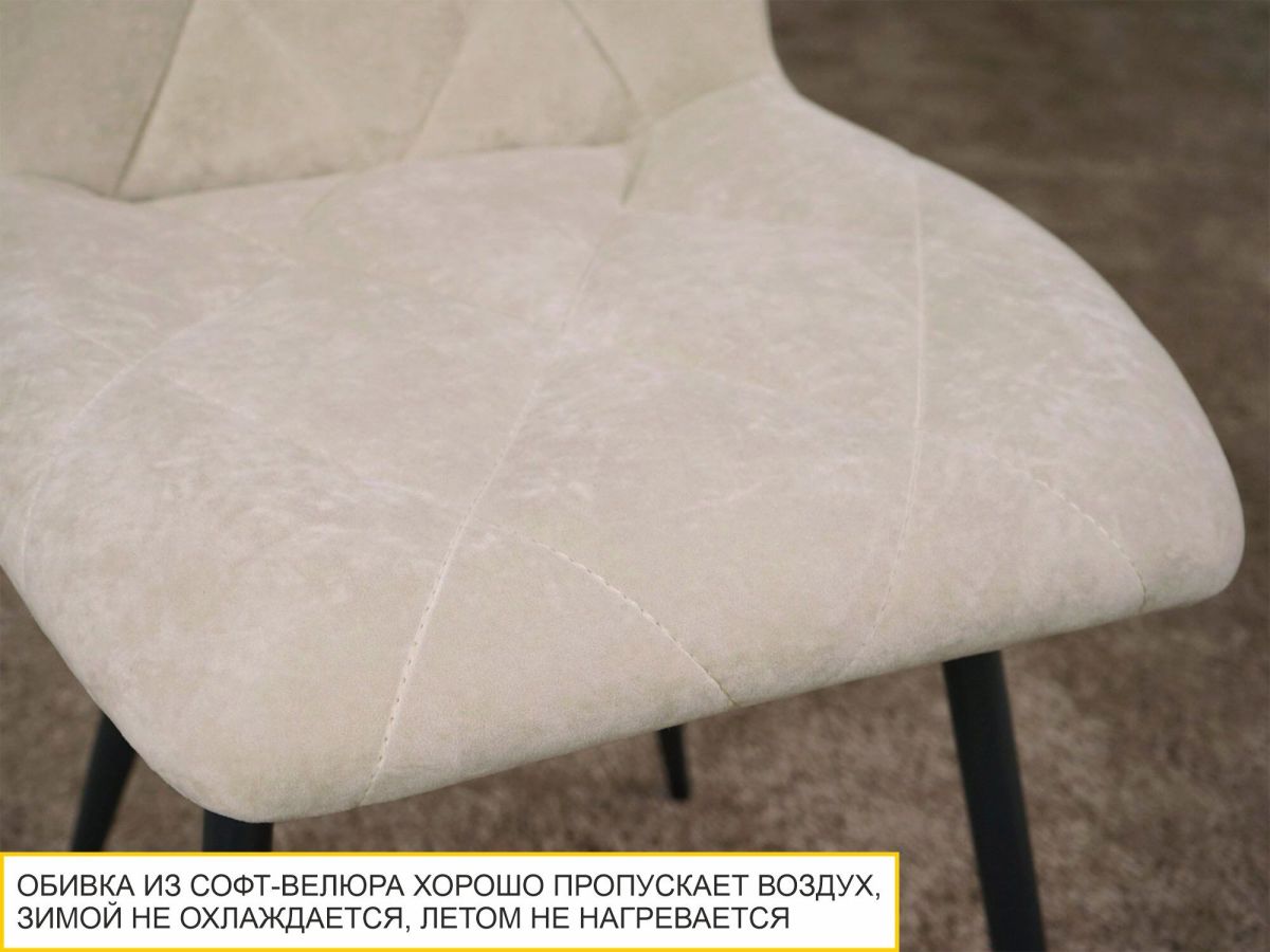 - Сиденье и спинка стула выполнены из практичного, но приятного на ощупь софт-велюра, который не требует специального ухода и легко чистится.