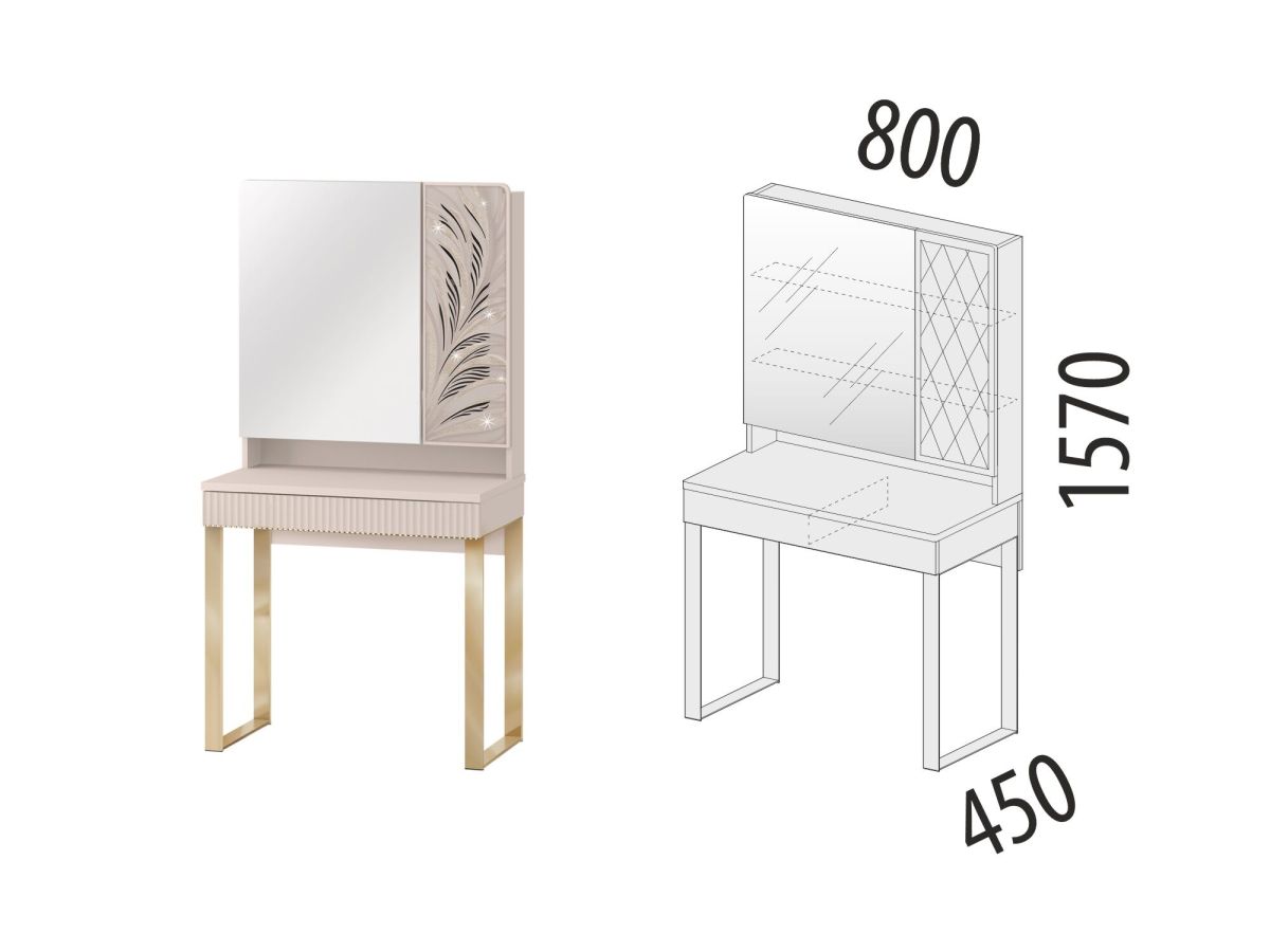 Туалетный столик «Флоренция 904.30» является частью модульной программы «Флоренция». Спальня «Флоренция» – это образец изящности и современной роскоши. Нежный цвет «Кашемир» создает светлую и теплую основу в интерьере, которая наполняет пространство спокойствием и гармонией. Оригинальные элементы в цвете «сатиновое золото» и элегантная фрезеровка подчеркивают утонченный дизайн коллекции.