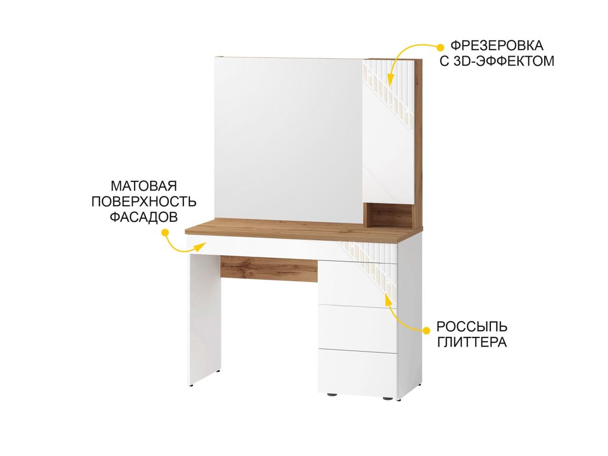 Туалетный столик «Монако 903.06» является частью модульной программы «Монако 903». Коллекция «Монако» - это образец элегантного стиля и утонченного вкуса. Сочетание матовой белоснежной поверхности фасадов с благородной древесной текстурой подчеркивает изысканный дизайн коллекции.
