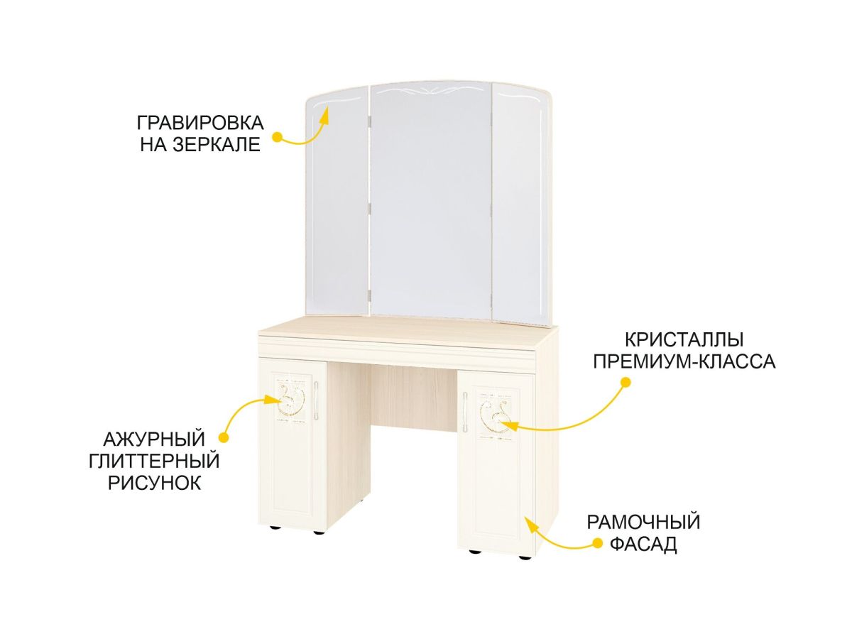 Туалетный столик «Тиффани 93.06» является частью модульной программы «Тиффани». Коллекция «Тиффани» - символ классического стиля и незабываемого шарма. Нежные светлые фасады и изысканность декора - отличительная черта коллекции. Ажурные декоративные элементы и кристаллы придают уникальность коллекции.
