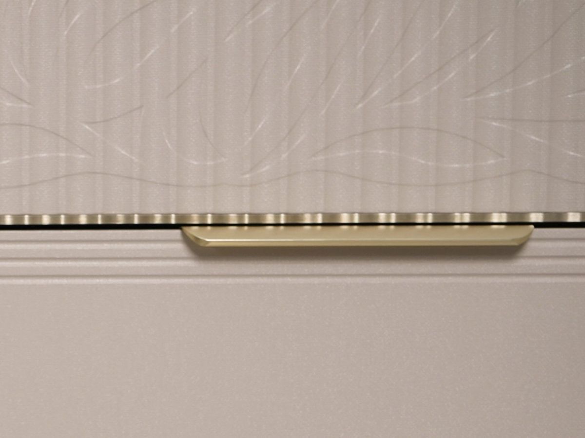 - Металлическая пластина на фасаде толщиной 5 мм проходит обработку по собственной технологии покрытия, которая придает ей изысканный оттенок «сатинового золота». Она гармонично сочетается с цветом фурнитуры и повторяет геометрию вертикальных реек.
