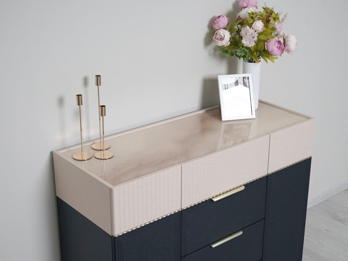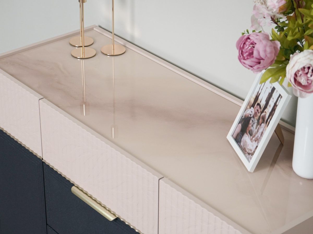 • Стеклянный топ комода декорирован дизайнерским рисунком «Мрамор». Легкое мерцание глиттера придает поверхности глубину и добавляет в интерьер нотку роскоши.