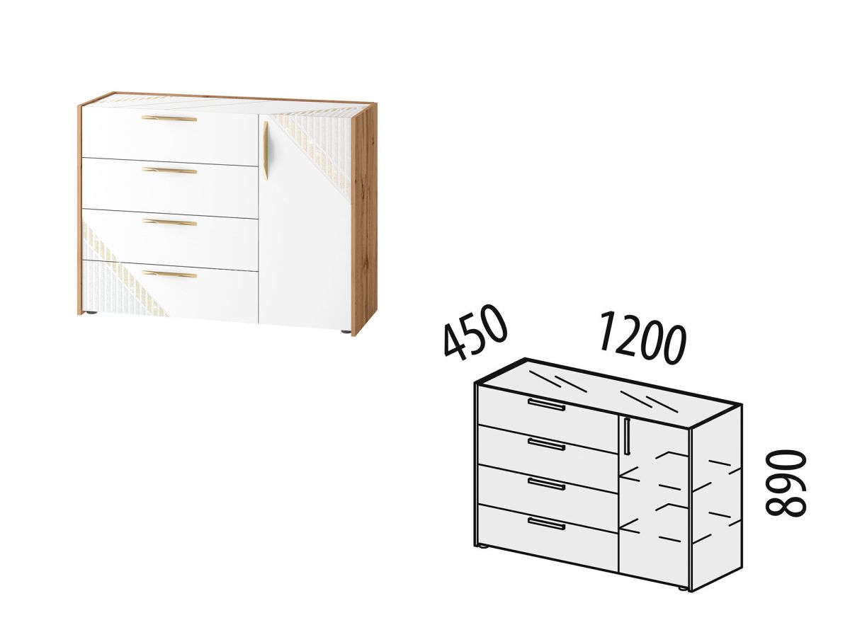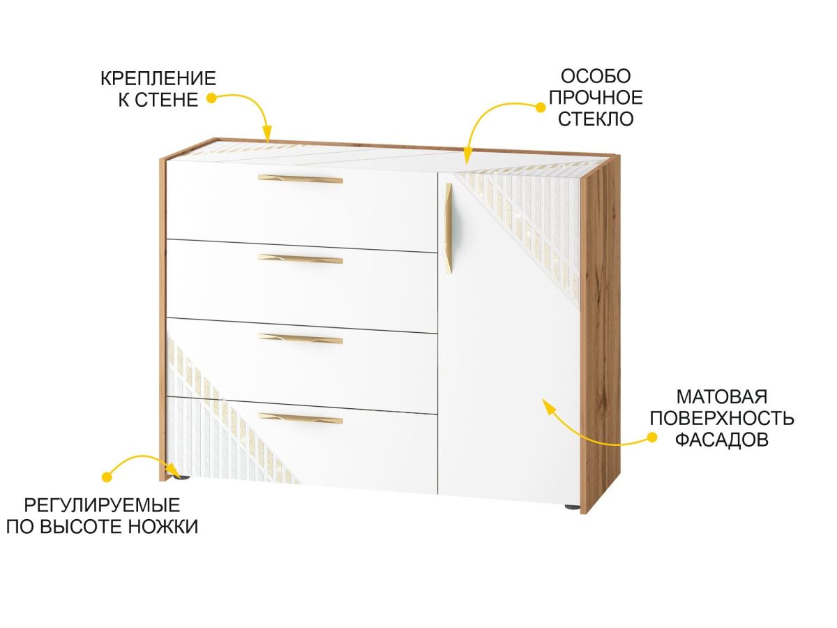 - Комод произведен из МДФ и ЛДСП повышенной плотности. Материал устойчив к механическим и термическим воздействиям. ЛДСП выдерживает min 300 циклов на истирание, что почти в 5 раз больше, чем требуется по ГОСТу (min 65).