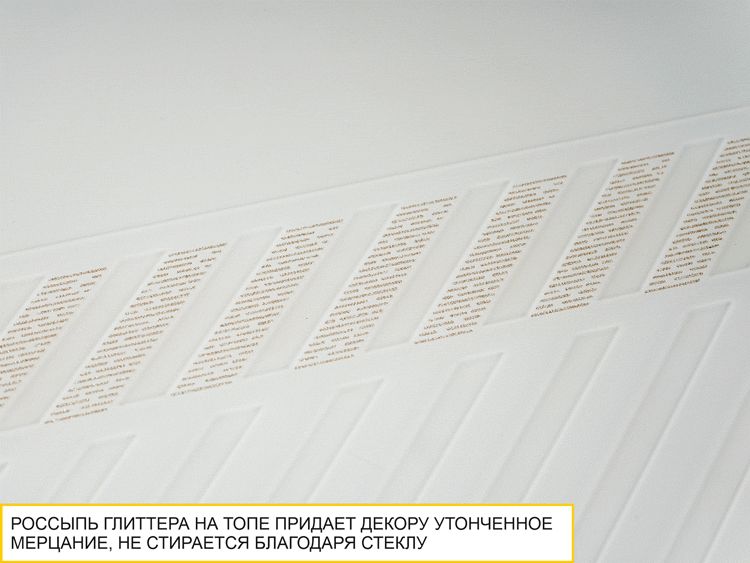 - Топ комода декорирован дизайнерским рисунком на стекле. Сочетание матовой и глянцевой поверхности формирует оригинальный узор, который плавно переходит в рисунок на фасаде. Благодаря наличию стекла на крышке комода глиттерный рисунок не стирается и не выцветает со временем.