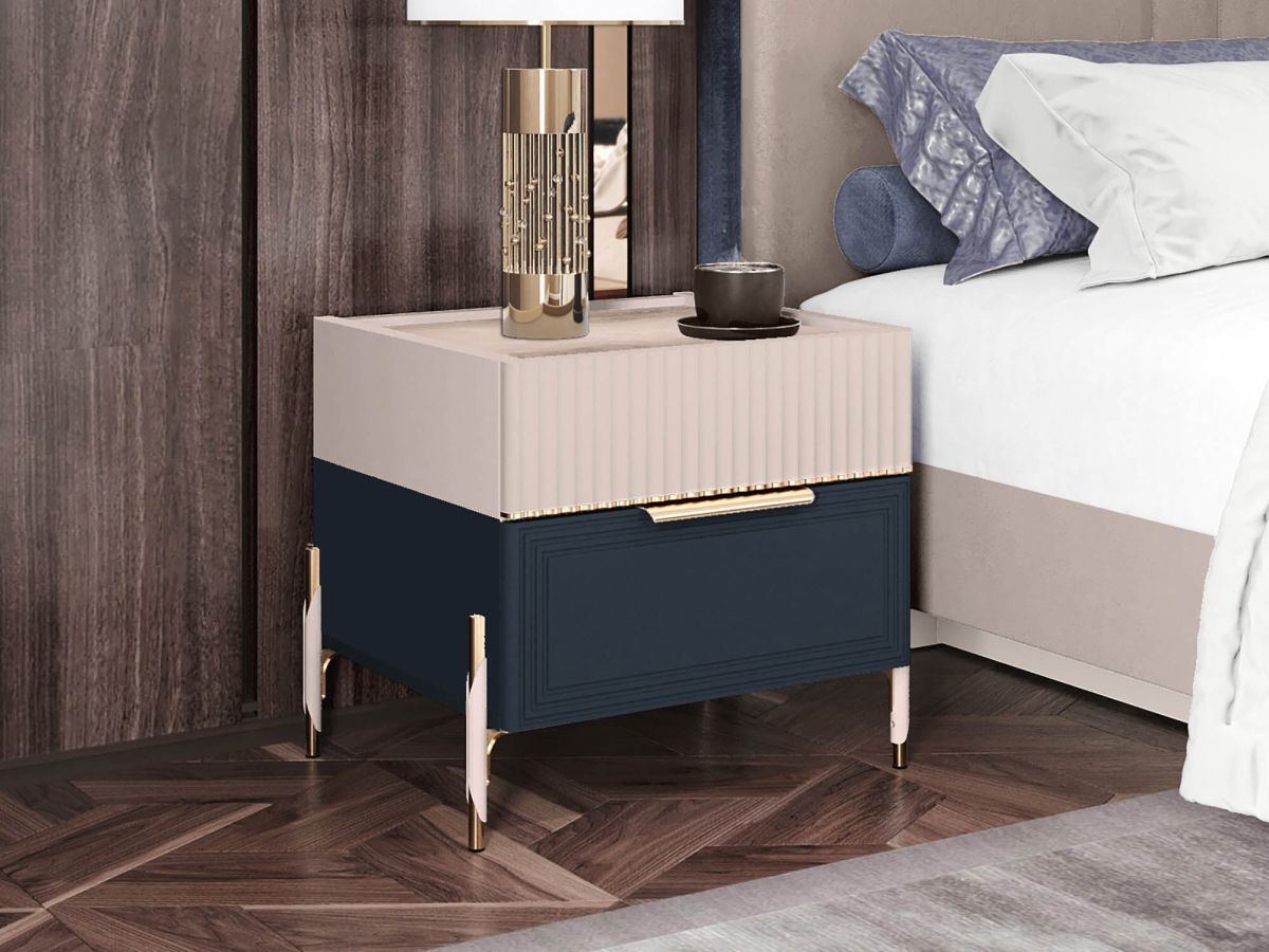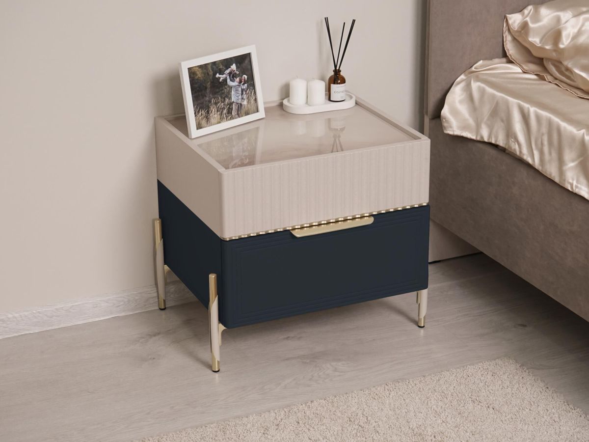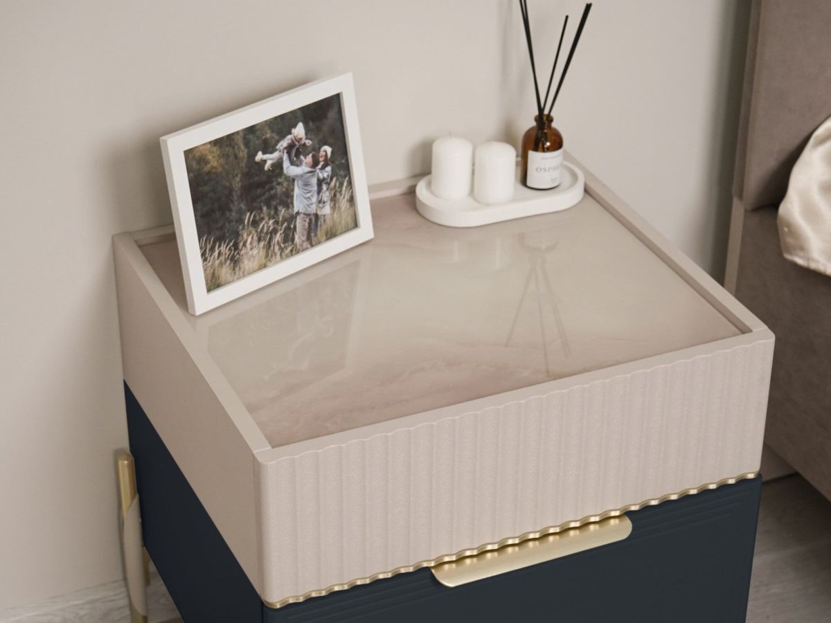 Прикроватная тумба «Флоренция 905.07» является частью модульной программы «Флоренция». Спальня «Флоренция» – это образец изящности и современной роскоши. Цвета «Кашемир» и «Индиго» образуют стильный и теплый дуэт: светлый тон наполняет пространство мягкостью, а насыщенный темно-синий придает интерьеру глубину и изысканность. Оригинальные элементы в цвете «сатиновое золото» и элегантная фрезеровка подчеркивают утонченный дизайн коллекции.